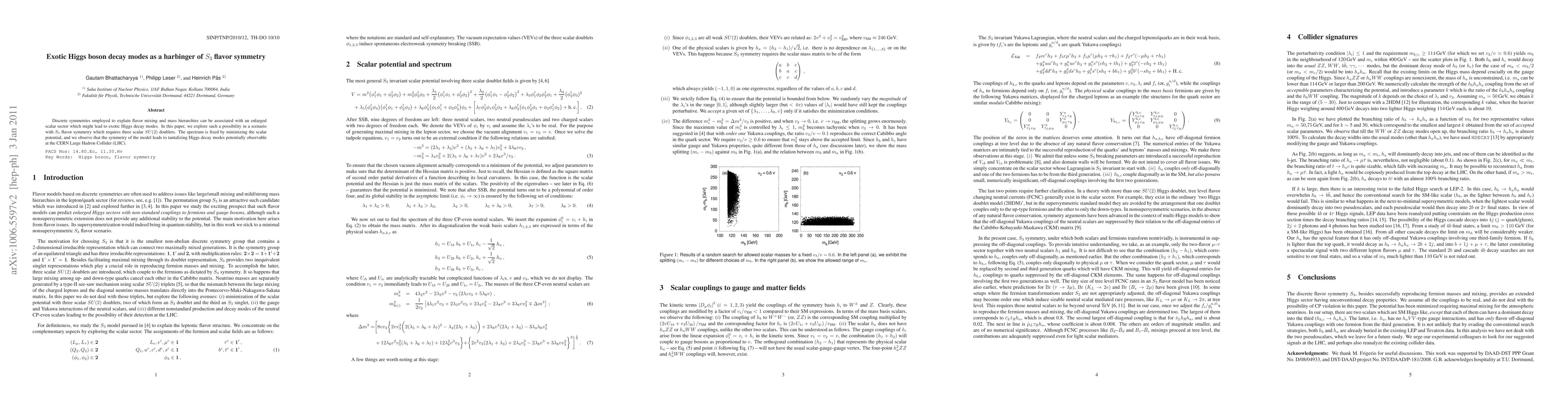 Discrete symmetries employed to explain flavor mixing and mass hierarchies can be associated with an enlarged scalar sector which might lead to exotic Higgs decay modes. In this paper, we explore such a possibility in a scenario with $S_3$ flavor symmetry which requires three scalar SU(2) doublets. The spectrum is fixed by minimizing the scalar potential, and we observe that the symmetry of the model leads to tantalizing Higgs decay modes potentially observable at the CERN Large Hadron Collider (LHC).