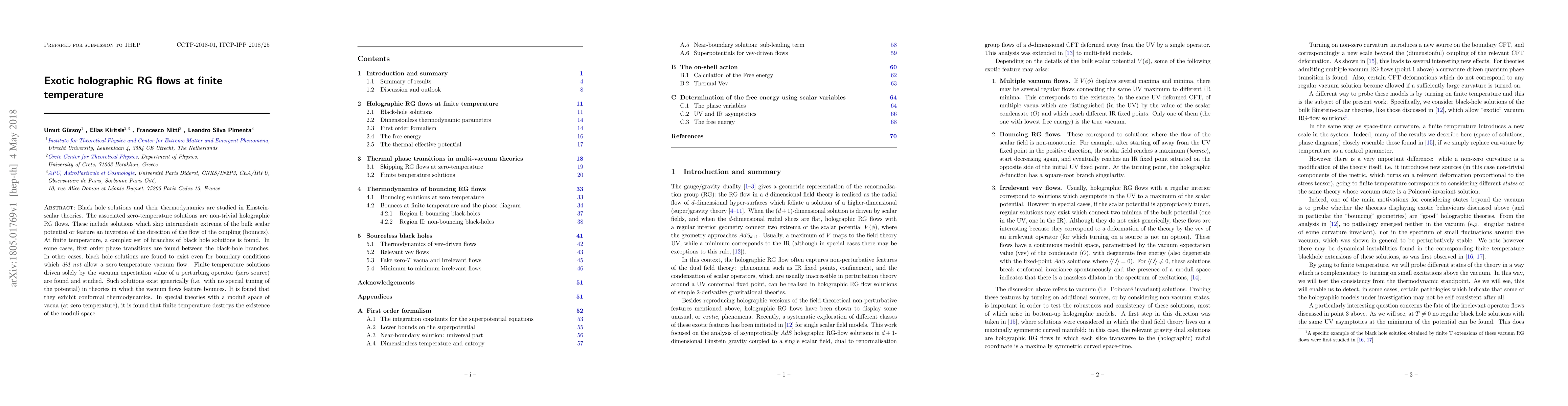 This paper investigates exotic holographic renormalization group (RG) flows in Einstein-scalar theories at finite temperature, finding complex black hole solutions and phase transitions, particularly those with unconventional thermodynamic behaviors and the destruction of moduli spaces of vacua at non-zero temperatures.