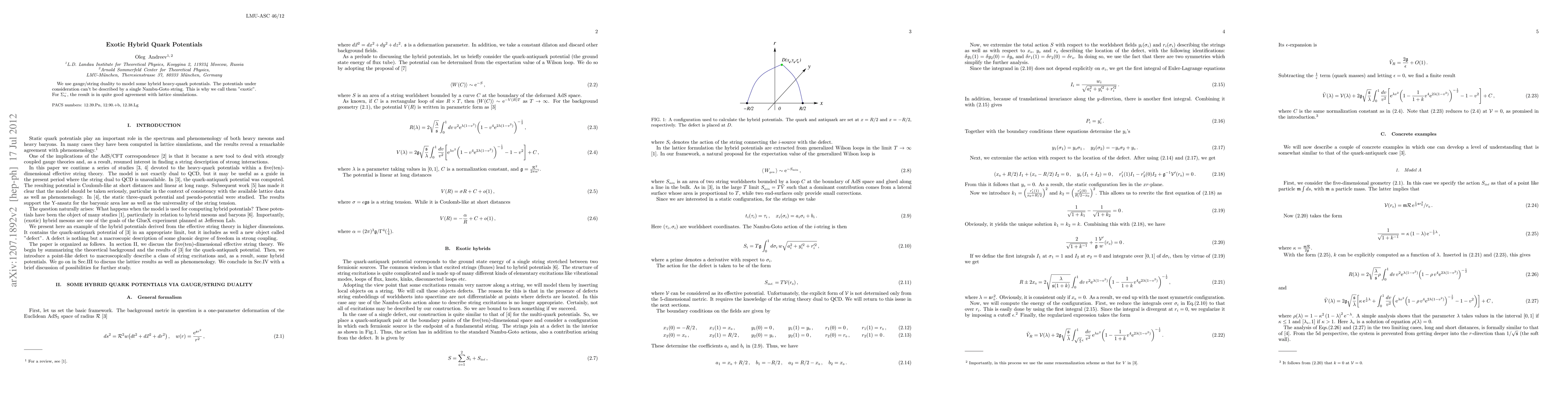 This paper employs gauge/string duality to explore "exotic" hybrid heavy-quark potentials that cannot be modeled by a single Nambu-Goto string, achieving good agreement with lattice simulations for $\Sigma_u^-$.