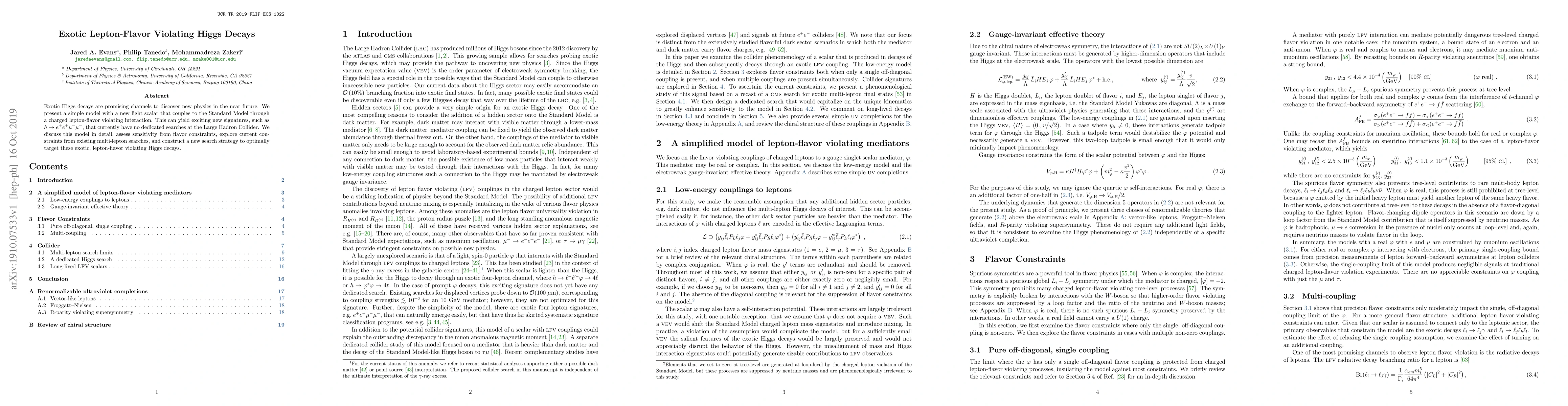 This paper proposes a model featuring a new light scalar that induces exotic lepton-flavor violating Higgs decays, such as $h \to e^+ e^+ \mu^- \mu^-$. It assesses current experimental constraints and develops a new search strategy to target these unique decay signatures.