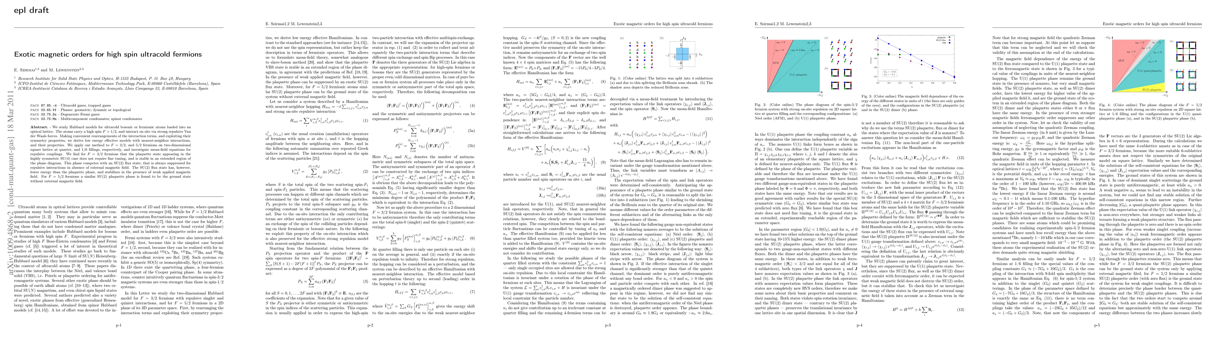 We study Hubbard models for ultracold bosonic or fermionic atoms loaded into an optical lattice. The atoms carry a high spin $F>1/2$, and interact on site via strong repulsive Van der Waals forces. Making convenient rearrangements of the interaction terms, and exploiting their symmetry properties, we derive low energy effective models with nearest-neighbor interactions, and their properties. We apply our method to $F=3/2$, and 5/2 fermions on two-dimensional square lattice at quarter, and 1/6 fillings, respectively, and investigate mean-field equations for repulsive couplings. We find for $F=3/2$ fermions that the plaquette state appearing in the highly symmetric SU(4) case does not require fine tuning, and is stable in an extended region of the phase diagram. This phase competes with an SU(2) flux state, that is always suppressed for repulsive interactions in absence of external magnetic field. The SU(2) flux state has, however, lower energy than the plaquette phase, and stabilizes in the presence of weak applied magnetic field. For $F=5/2$ fermions a similar SU(2) plaquette phase is found to be the ground state without external magnetic field.