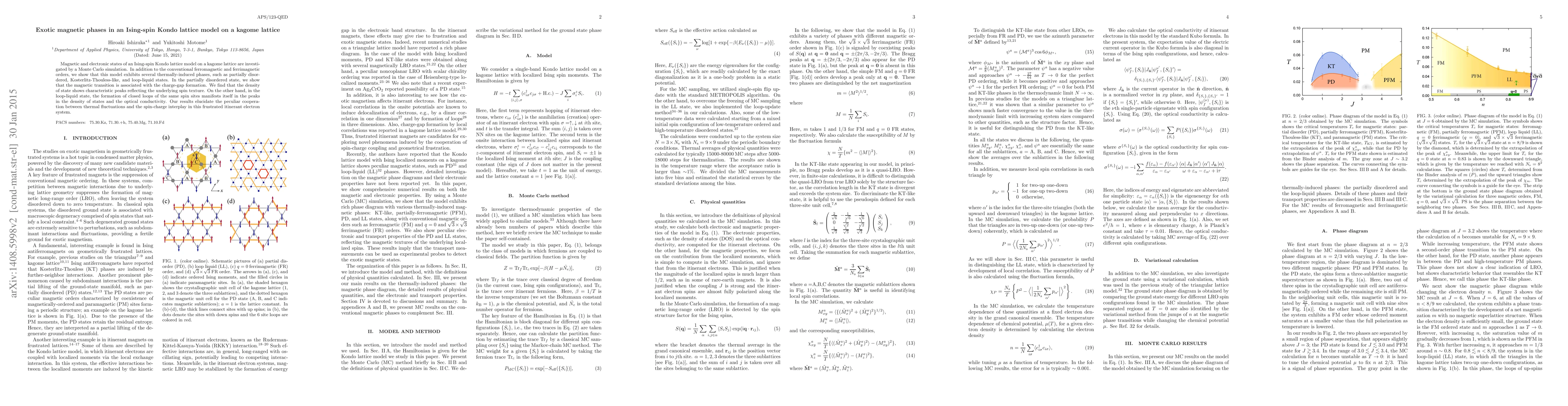 This study investigates the magnetic and electronic states of an Ising-spin Kondo lattice model on a kagome lattice using Monte Carlo simulations, revealing exotic thermally-induced phases including partially disordered, Kosteritz-Thouless-like, and loop-liquid states, alongside characteristic peaks in the density of states and optical conductivity.