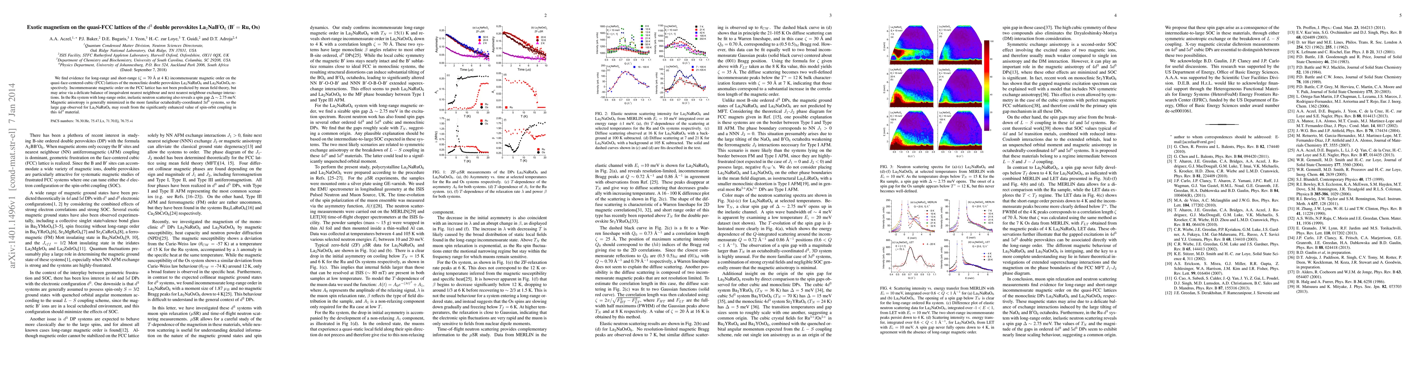 This study reveals incommensurate magnetic order in the quasi-FCC lattices of La$_2$NaRuO$_6$ and La$_2$NaOsO$_6$, challenging mean field theory predictions. The Ru system exhibits a spin gap, suggesting enhanced spin-orbit coupling in the $4d^3$ system.