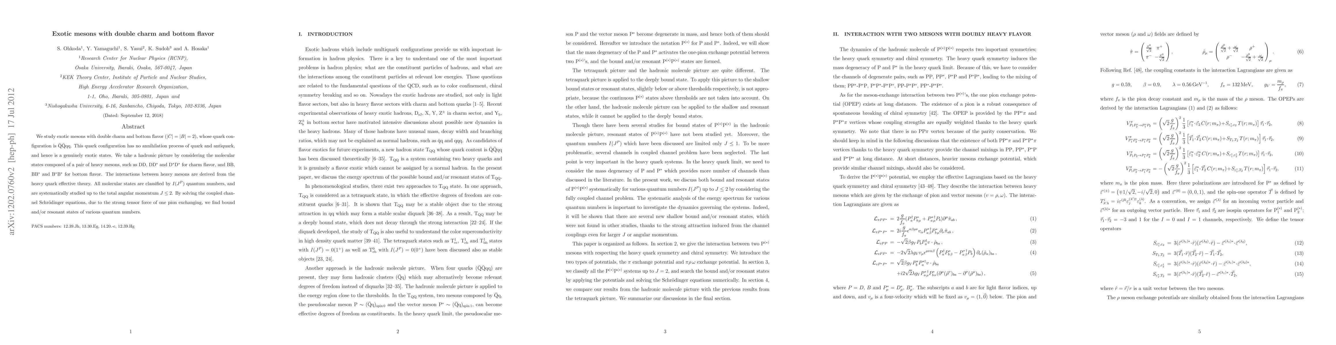 We study exotic mesons with double charm and bottom flavor, whose quark configuration is \bar{Q}\bar{Q}qq. This quark configuration has no annihilation process of quark and antiquark, and hence is a genuinely exotic states. We take a hadronic picture by considering the molecular states composed of a pair of heavy mesons, such as DD, DD* and D*D* for charm flavor, and BB, BB* and B*B* for bottom flavor. The interactions between heavy mesons are derived from the heavy quark effective theory. All molecular states are classified by I(J^P) quantum numbers, and are systematically studied up to the total angular momentum J \leq 2. By solving the coupled channel Schrodinger equations, due to the strong tensor force of one pion exchanging, we find bound and/or resonant states of various quantum numbers.