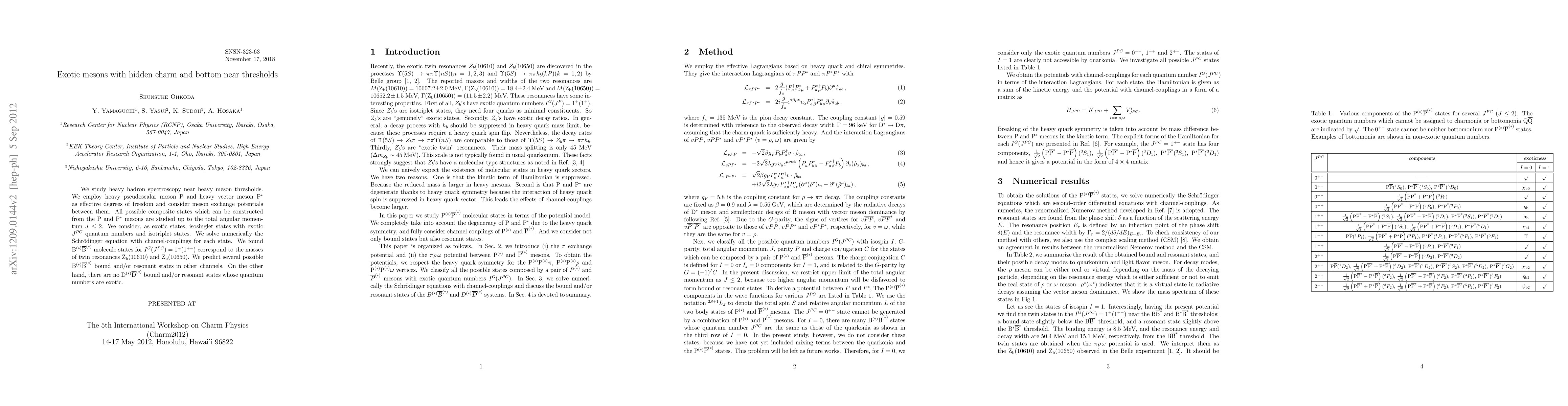 This paper investigates the spectroscopy of exotic mesons composed of hidden charm and bottom near production thresholds, finding B(*)barB(*) molecule states corresponding to Zb(10610) and Zb(10650) resonances, while predicting additional B(*)barB(*) bound or resonant states, with no exotic quantum numbers.