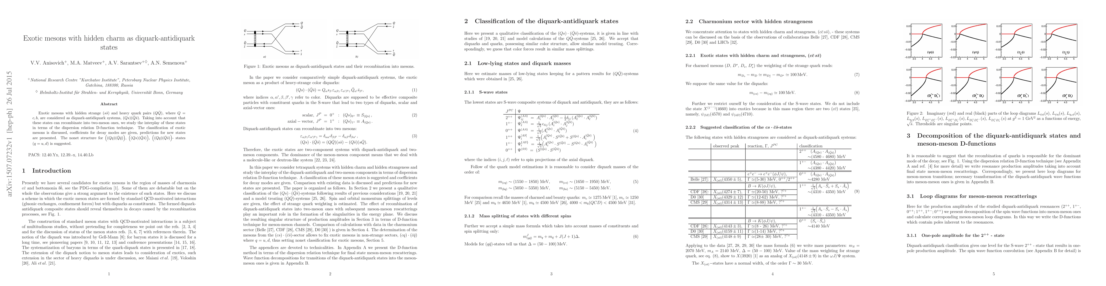 Exotic mesons with hidden strange ($s\bar s$) and heavy quark pairs ($Q\bar Q$), where $Q=c,b$, are considered as diquark-antidiquark systems, $(Qs)(\bar Q\bar s)$. Taking into account that these states can recombinate into two-meson ones, we study the interplay of these states in terms of the dispersion relation D-function technique. The classification of exotic mesons is discussed, coefficients for decay modes are given, predictions for new states are presented. The nonet structure for $((Qq)(\bar Q \bar q)$, ($(Qs)(\bar Q\bar s$)), ($(Qq)(\bar Q\bar s))$- states ($q=u,d$) is suggested.
