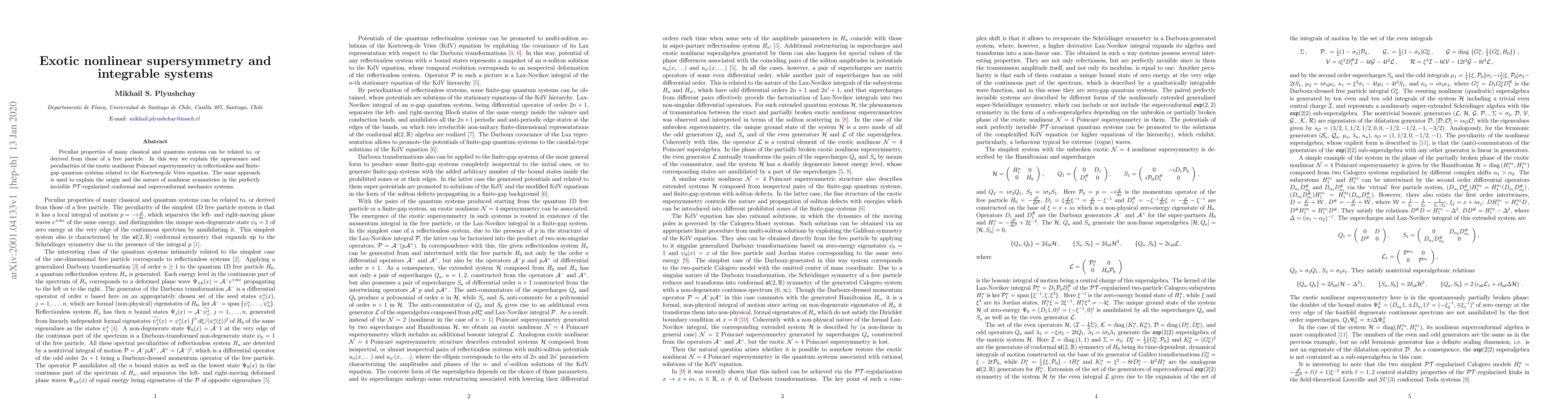 This paper explores the connection between exotic nonlinear supersymmetry and integrable systems, demonstrating how classical and quantum systems exhibit properties derived from free particle dynamics. It specifically explains the emergence of exotic nonlinear Poincaré supersymmetry in reflectionless quantum systems and nonlinear symmetries in $\mathcal{PT}$-regularized conformal and superconformal mechanics.