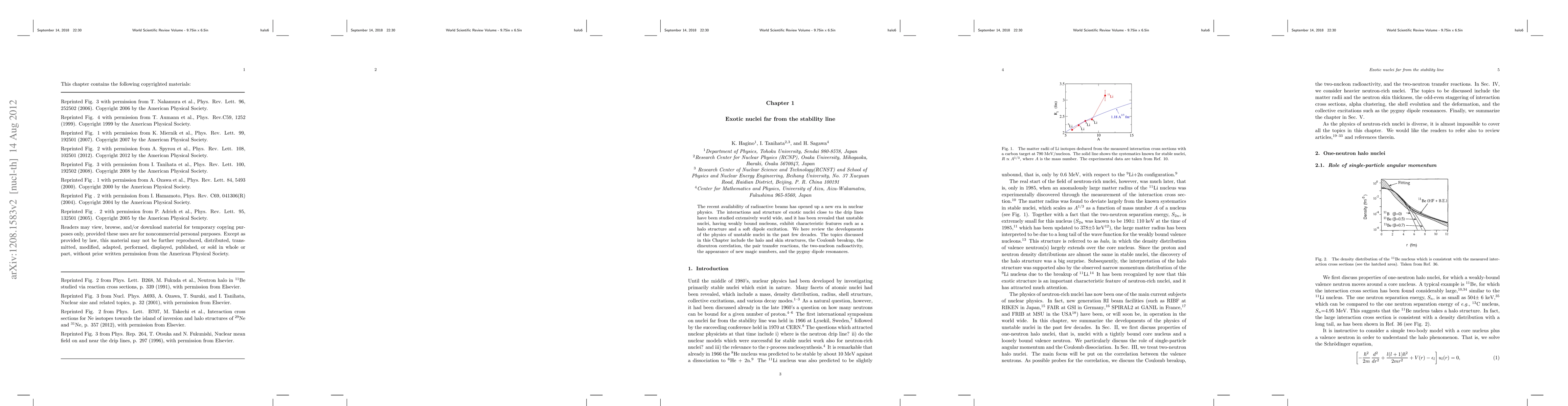 The recent availability of radioactive beams has opened up a new era in nuclear physics. The interactions and structure of exotic nuclei close to the drip lines have been studied extensively world wide, and it has been revealed that unstable nuclei, having weakly bound nucleons, exhibit characteristic features such as a halo structure and a soft dipole excitation. We here review the developments of the physics of unstable nuclei in the past few decades. The topics discussed in this Chapter include the halo and skin structures, the Coulomb breakup, the dineutron correlation, the pair transfer reactions, the two-nucleon radioactivity, the appearance of new magic numbers, and the pygmy dipole resonances.