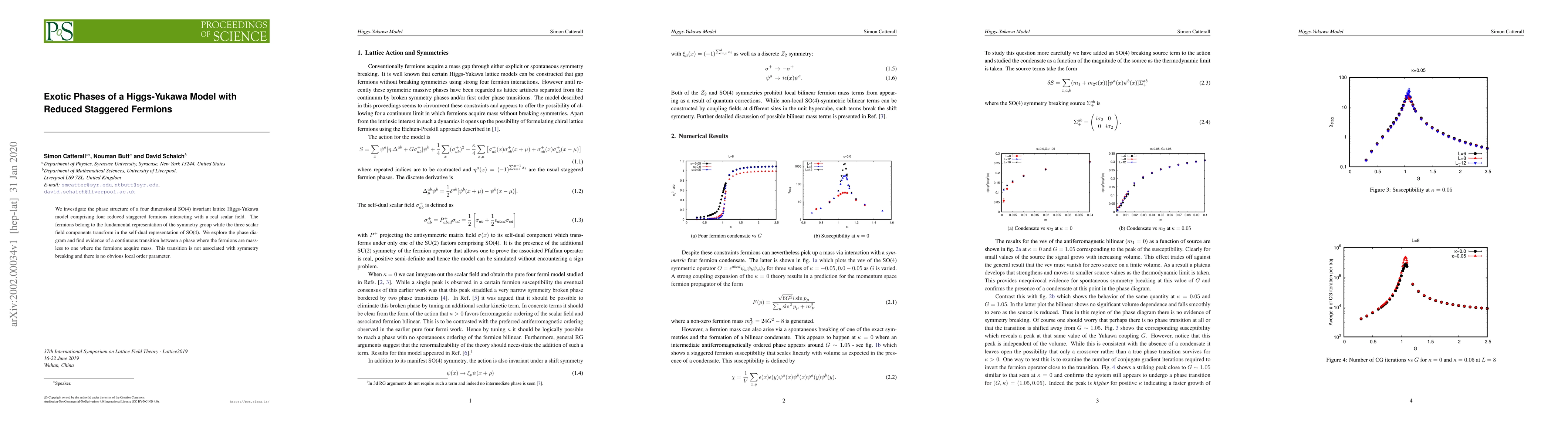 We investigate the phase structure of a four dimensional SO(4) invariant lattice Higgs-Yukawa model comprising four reduced staggered fermions interacting with a real scalar field. The fermions belong to the fundamental representation of the symmetry group while the three scalar field components transform in the self-dual representation of SO(4). We explore the phase diagram and find evidence of a continuous transition between a phase where the fermions are massless to one where the fermions acquire mass. This transition is not associated with symmetry breaking and there is no obvious local order parameter.