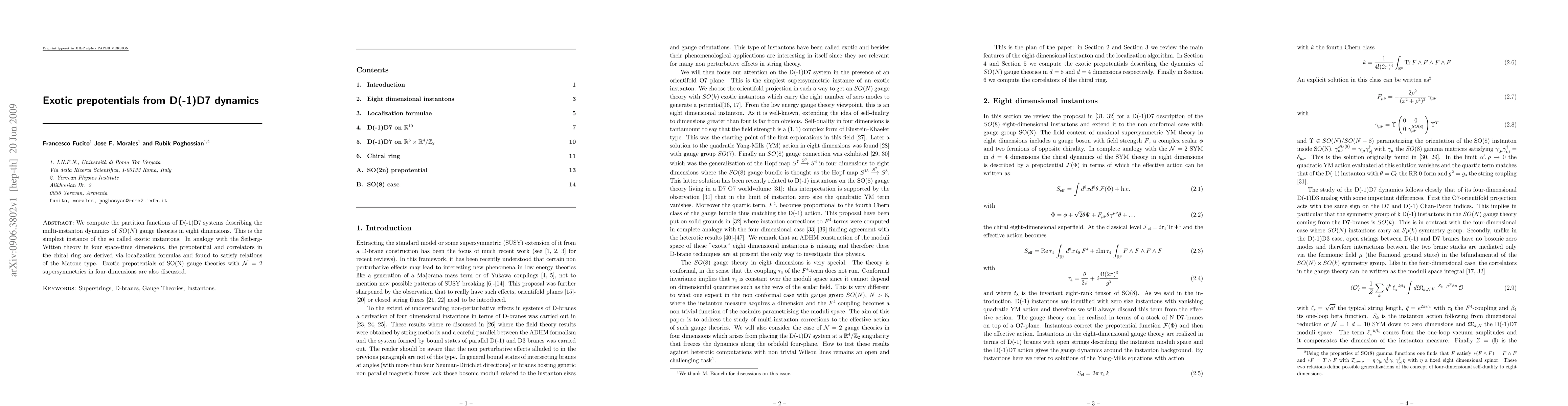 We compute the partition functions of D(-1)D7 systems describing the multi-instanton dynamics of SO(N) gauge theories in eight dimensions. This is the simplest instance of the so called exotic instantons. In analogy with the Seiberg-Witten theory in four space-time dimensions, the prepotential and correlators in the chiral ring are derived via localization formulas and found to satisfy relations of the Matone type. Exotic prepotentials of SO(N) gauge theories with N=2 supersymmetries in four-dimensions are also discussed.