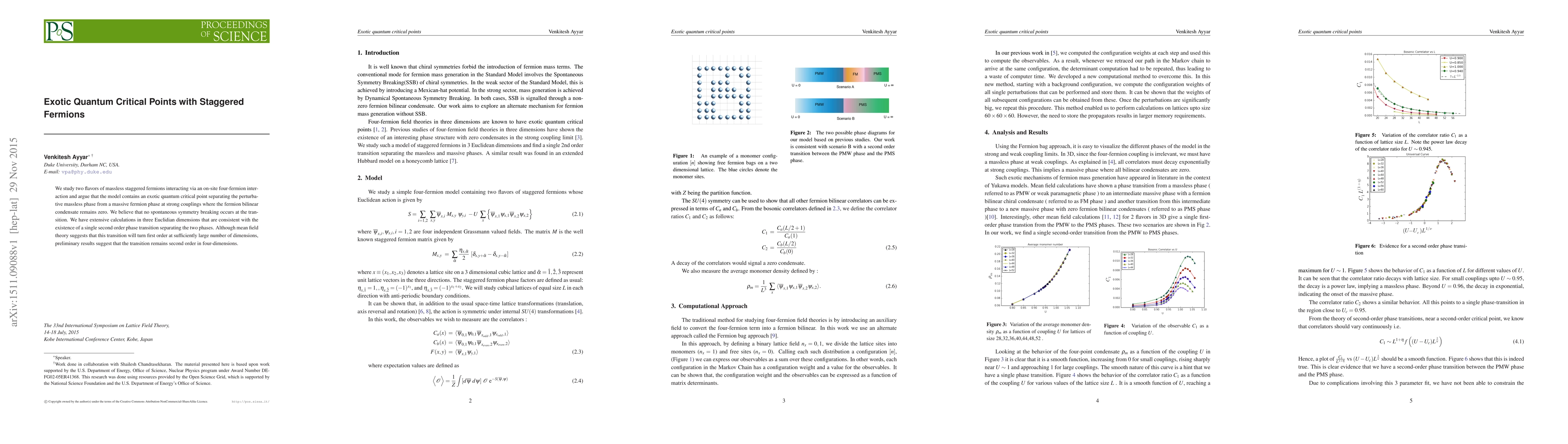 We study two flavors of massless staggered fermions interacting via an on-site four-fermion inter- action and argue that the model contains an exotic quantum critical point separating the perturba- tive massless phase from a massive fermion phase at strong couplings where the fermion bilinear condensate remains zero. We believe that no spontaneous symmetry breaking occurs at the tran- sition. We have extensive calculations in three Euclidian dimensions that are consistent with the existence of a single second order phase transition separating the two phases. Although mean field theory suggests that this transition will turn first order at sufficiently large number of dimensions, preliminary results suggest that the transition remains second order in four-dimensions.