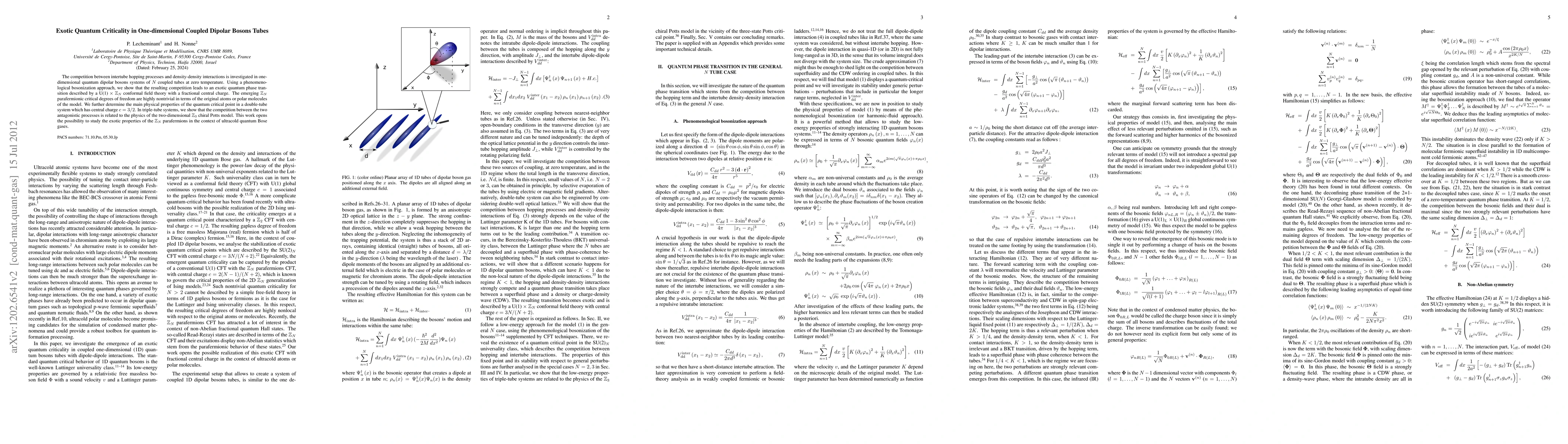 This paper investigates quantum criticality in one-dimensional coupled dipolar boson systems, revealing an exotic quantum phase transition described by a U(1) x Z_N conformal field theory with fractional central charge. The study highlights the emergence of Z_N parafermionic critical degrees of freedom and explores their implications in double- and triple-tube systems.