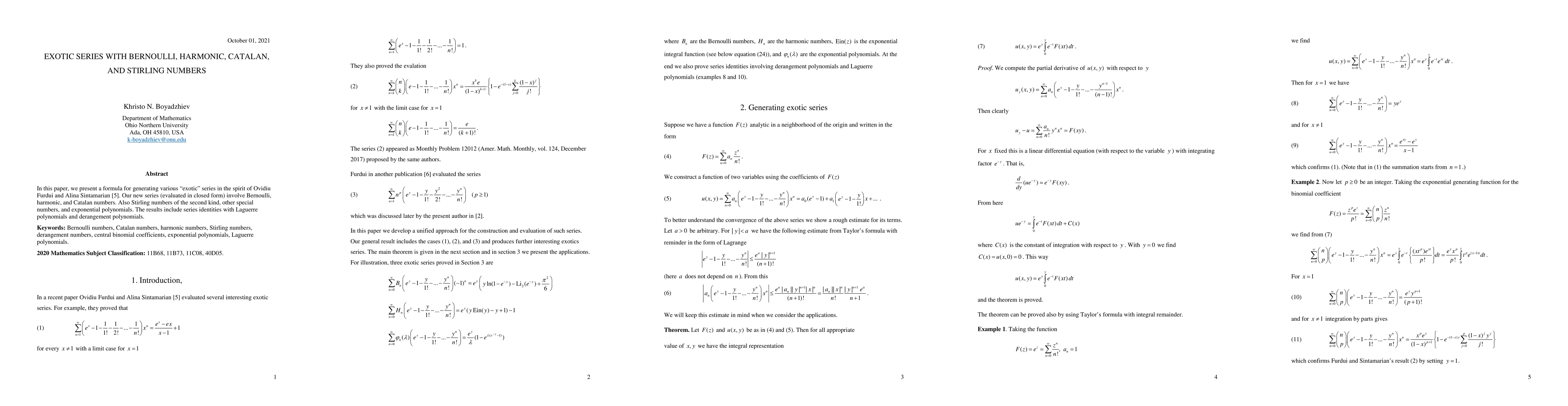 This paper introduces a novel formula for generating exotic series involving Bernoulli, harmonic, Catalan, and Stirling numbers, alongside special numbers and exponential polynomials, and establishes identities with Laguerre and derangement polynomials.