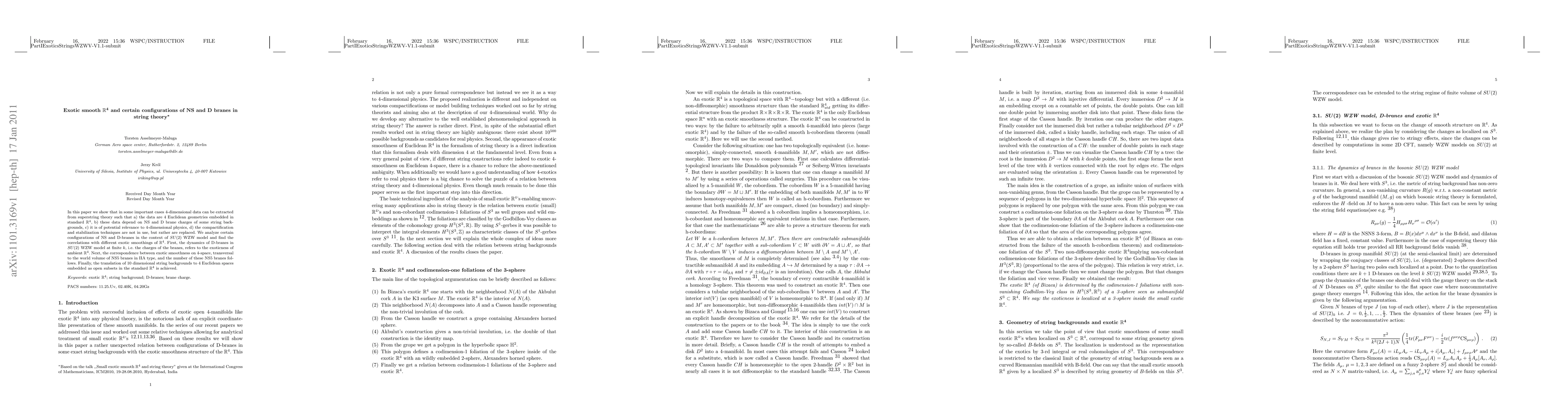 In this paper we show that in some important cases 4-dimensional data can be extracted from superstring theory such that a) the data are 4 Euclidean geometries embedded in standard $\mathbb{R}^{4}$, b) these data depend on NS and D brane charges of some string backgrounds, c) it is of potential relevance to 4-dimensional physics, d) the compactification and stabilization techniques are not in use, but rather are replaced. We analyze certain configurations of NS and D-branes in the context of $SU(2)$ WZW model and find the correlations with different exotic smoothings of $\mathbb{R}^{4}$. First, the dynamics of D-branes in $SU(2)$ WZW model at finite $k$, i.e. the charges of the branes, refers to the exoticness of ambient $\mathbb{R}^{4}$. Next, the correspondence between exotic smoothness on 4-space, transversal to the world volume of NS5 branes in IIA type, and the number of these NS5 branes follows. Finally, the translation of 10 dimensional string backgrounds to 4 Euclidean spaces embedded as open subsets in the standard $\mathbb{R}^{4}$ is achieved.