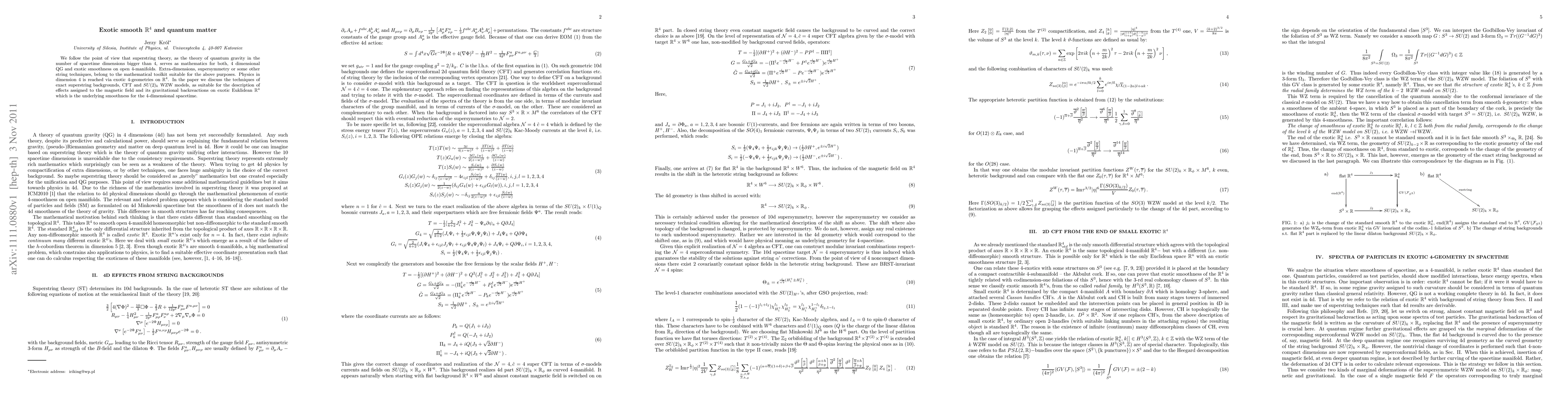 We follow the point of view that superstring theory, as the theory of quantum gravity in the number of spacetime dimensions bigger than 4, serves as mathematics for both, 4 dimensional QG and exotic smoothness on open 4-manifolds. Extra-dimensions, supersymmetry or some other string techniques, belong to the mathematical toolkit suitable for the above purposes. Physics in dimension 4 is reached via exotic 4-geometries on $\mathbb{R}^4$. In the paper we discuss the techniques of exact superstring backgrounds, CFT and $SU(2)_k$ WZW models, as suitable for the description of effects assigned to the magnetic field and its gravitational backreactions on exotic Euklidean $\mathbb{R}^4$ which is the underlying smoothness for the 4-dimensional spacetime.