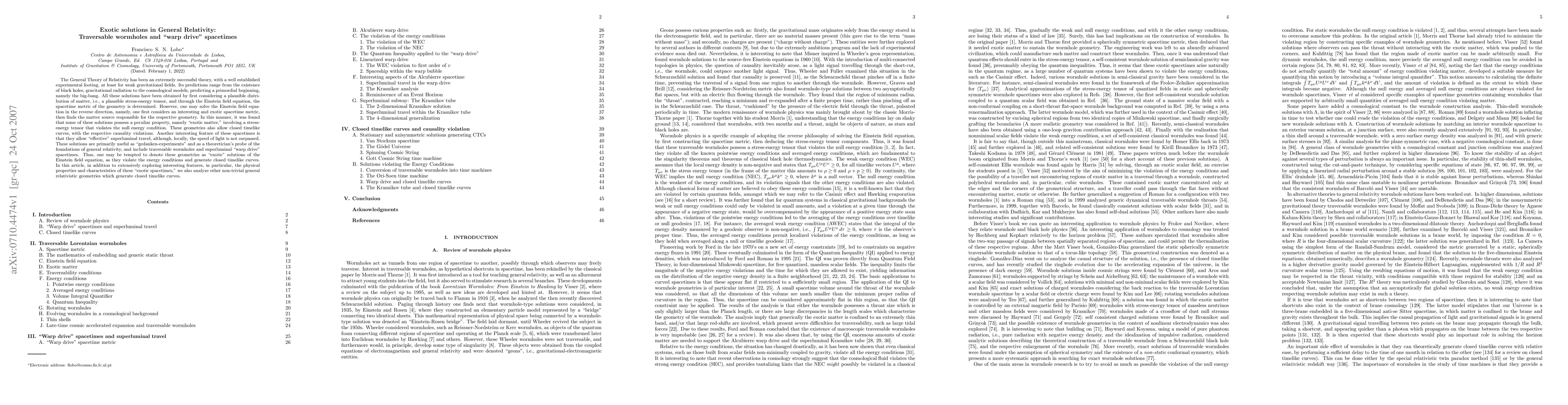 This paper explores exotic solutions in General Relativity, such as traversable wormholes and 'warp drive' spacetimes, which require 'exotic matter' violating energy conditions and can lead to closed timelike curves. These solutions serve as theoretical constructs to probe the foundations of general relativity.