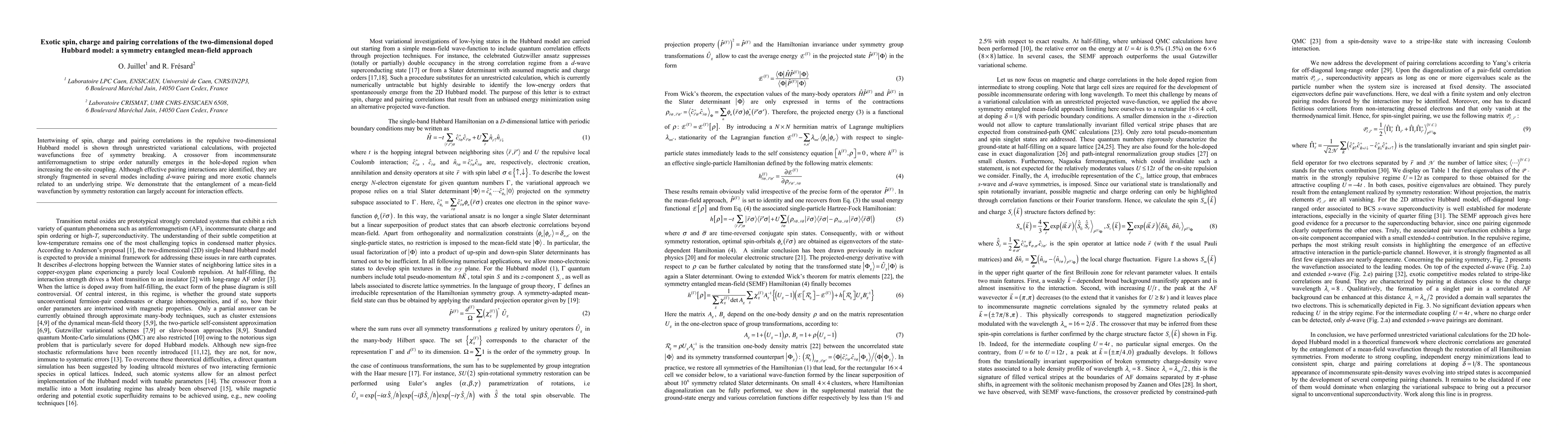 Intertwining of spin, charge and pairing correlations in the repulsive two-dimensional Hubbard model is shown through unrestricted variational calculations, with projected wavefunctions free of symmetry breaking. A crossover from incommensurate antiferromagnetism to stripe order naturally emerges in the hole-doped region when increasing the on-site coupling. Although effective pairing interactions are identified, they are strongly fragmented in several modes including d-wave pairing and more exotic channels related to an underlying stripe. We demonstrate that the entanglement of a mean-field wavefunction by symmetry restoration can largely account for interaction effects.