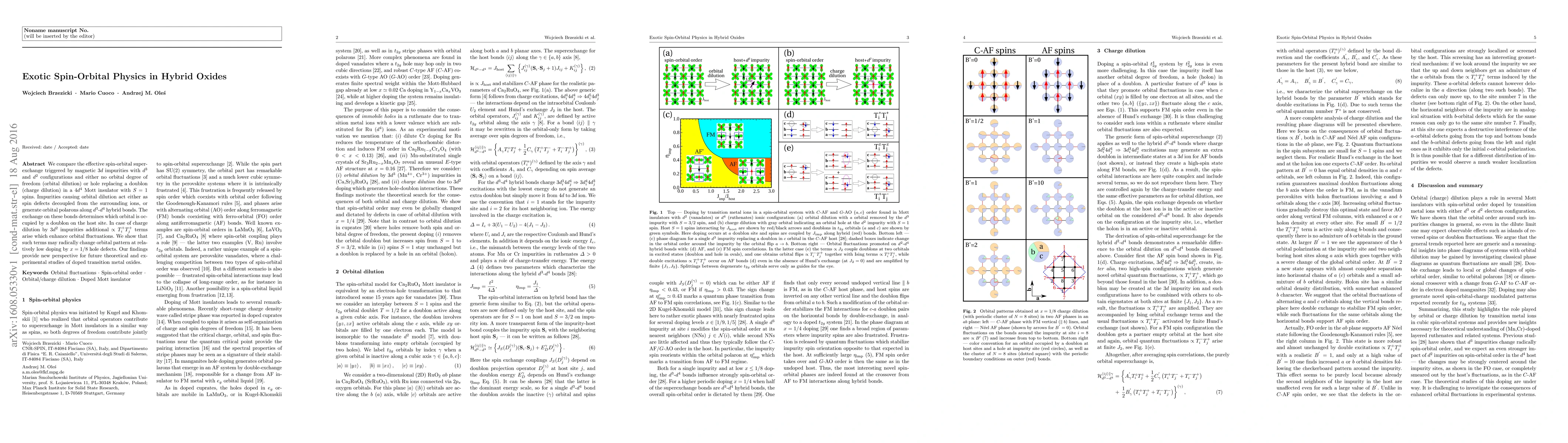 This paper investigates the spin-orbital interactions in hybrid oxides influenced by magnetic $3d$ impurities, revealing how orbital and charge dilution affect super-exchange mechanisms. The study finds that impurities can either create spin defects or induce orbital polarons, significantly altering the orbital occupancy and enhancing orbital fluctuations at low doping levels.