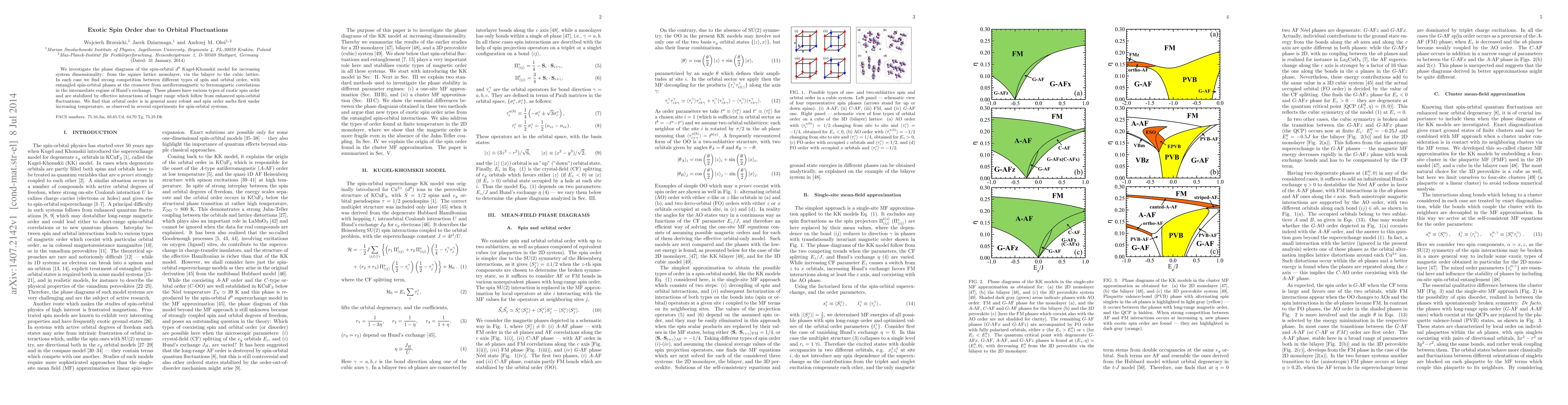 We investigate the phase diagrams of the spin-orbital $d^9$ Kugel-Khomskii model for increasing system dimensionality: from the square lattice monolayer, via the bilayer to the cubic lattice. In each case we find strong competition between different types of spin and orbital order, with entangled spin-orbital phases at the crossover from antiferromagnetic to ferromagnetic correlations in the intermediate regime of Hund's exchange. These phases have various types of exotic spin order and are stabilized by effective interactions of longer range which follow from enhanced spin-orbital fluctuations. We find that orbital order is in general more robust and spin order melts first under increasing temperature, as observed in several experiments for spin-orbital systems.