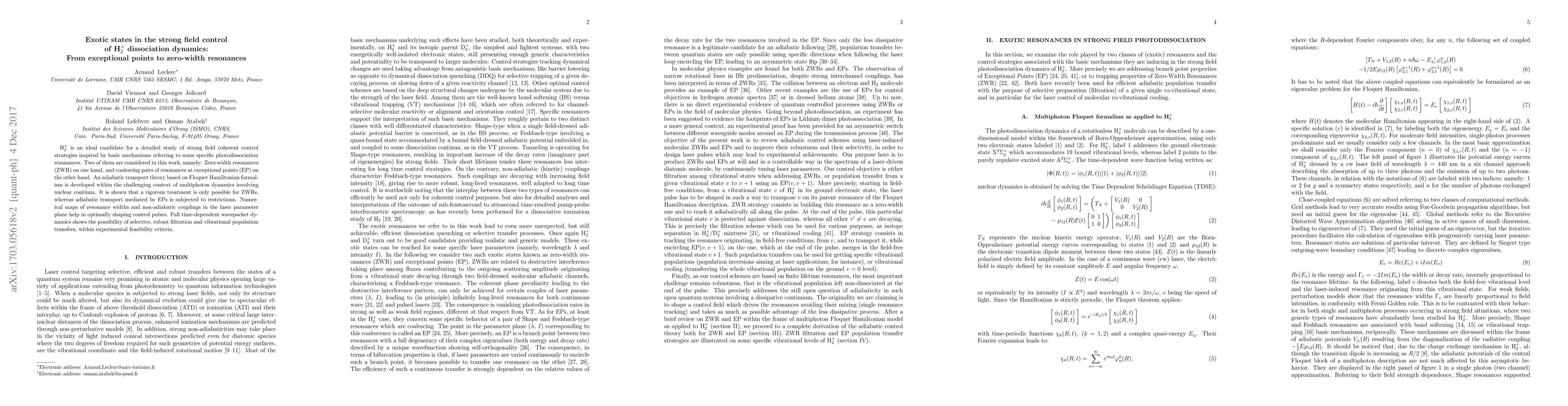 H$_2^+$ is an ideal candidate for a detailed study of strong field coherent control strategies inspired by basic mechanisms referring to some specific photodissociation resonances. Two of them are considered in this work, namely: Zero-width resonances (ZWR) on one hand, and coalescing pairs of resonances at exceptional points (EP) on the other hand. An adiabatic transport theory based on Floquet Hamiltonian formalism is developed within the challenging context of multiphoton dynamics involving nuclear continua. It is shown that a rigorous treatment is only possible for ZWRs, whereas adiabatic transport mediated by EPs is subjected to restrictions. Numerical maps of resonance widths and non-adiabatic couplings in the laser parameter plane help in optimally shaping control pulses. Full time-dependent wavepacket dynamics shows the possibility of selective, robust filtration and vibrational population transfers, within experimental feasibility criteria.