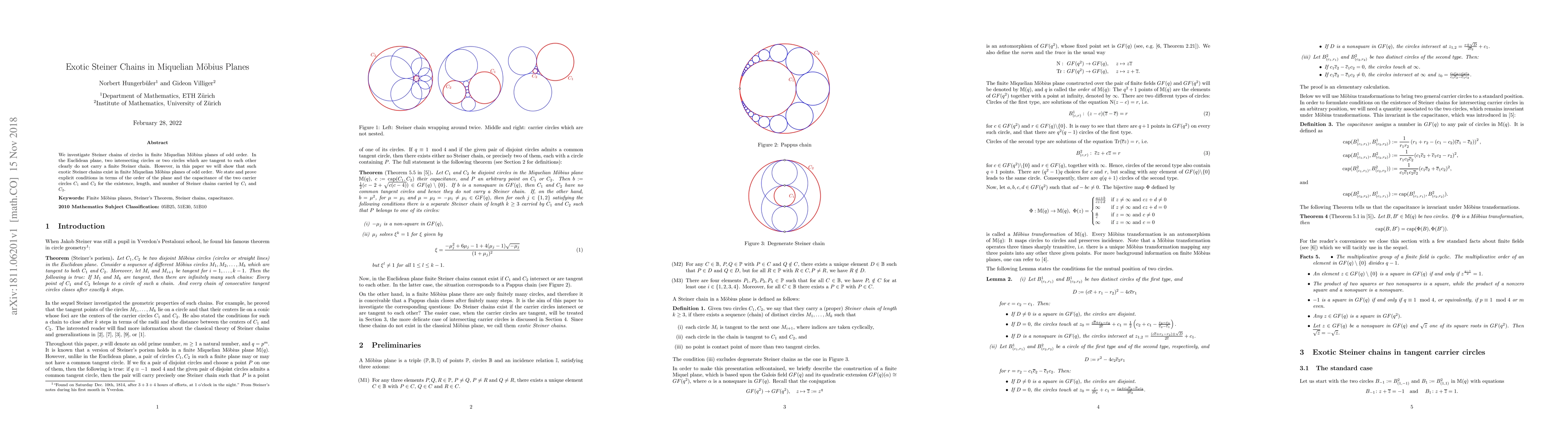 This paper explores the existence of exotic Steiner chains in finite Miquelian M\"obius planes of odd order, demonstrating that such chains can exist between certain intersecting or tangent circles. It provides explicit conditions based on the plane's order and the capacitance of the circles for the formation, length, and number of these Steiner chains.