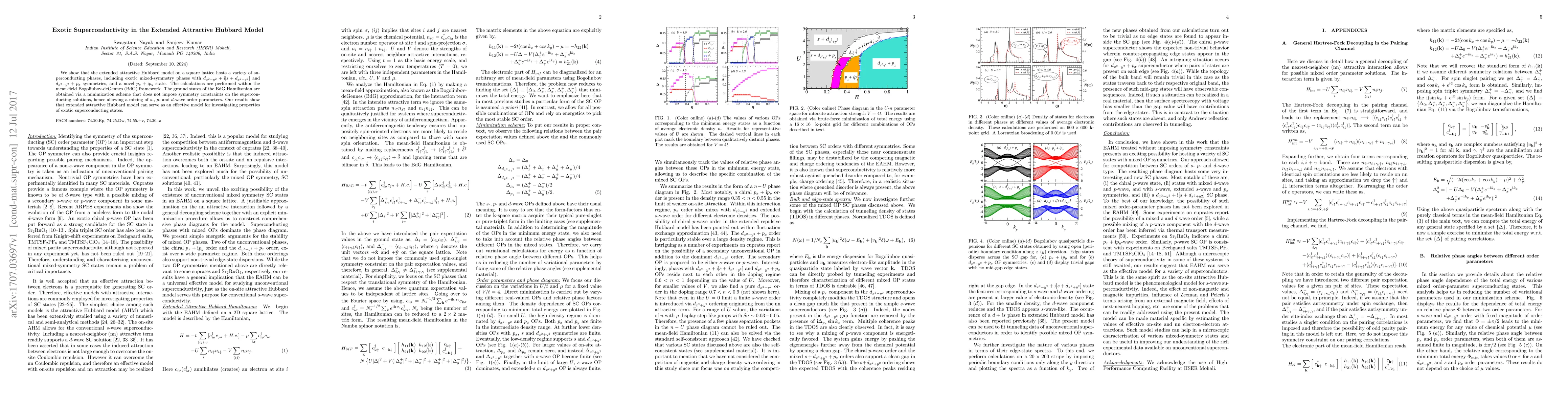 This paper demonstrates that the extended attractive Hubbard model on a square lattice supports diverse superconducting phases, including novel mixed-symmetry and unconventional $p_x + {\rm i} p_y$ states, using a mean-field Bogoliubov-deGennes framework without symmetry constraints. The findings suggest the model's utility in exploring exotic superconductivity.