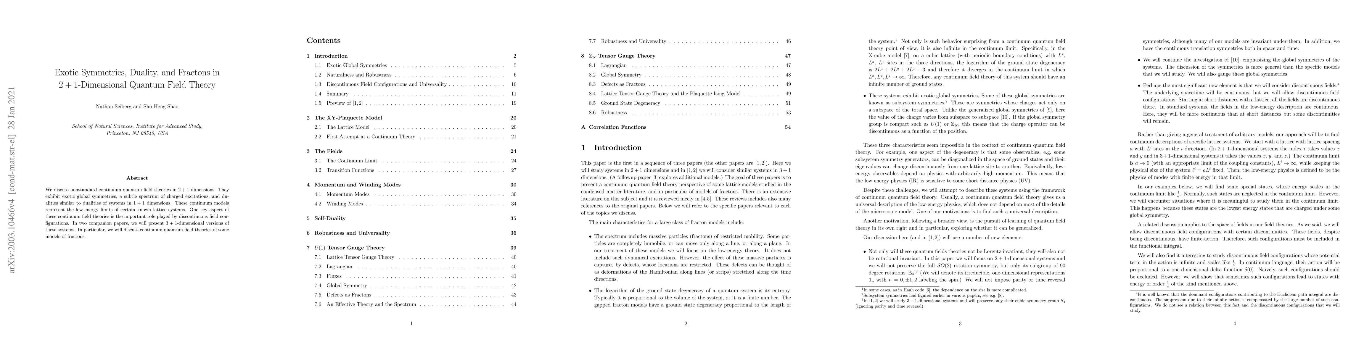 This paper explores exotic 2+1-dimensional quantum field theories featuring unusual global symmetries and dualities akin to 1+1-dimensional systems. It highlights the significance of discontinuous field configurations and their role in the low-energy limits of specific lattice models, with fractons being a particular focus.