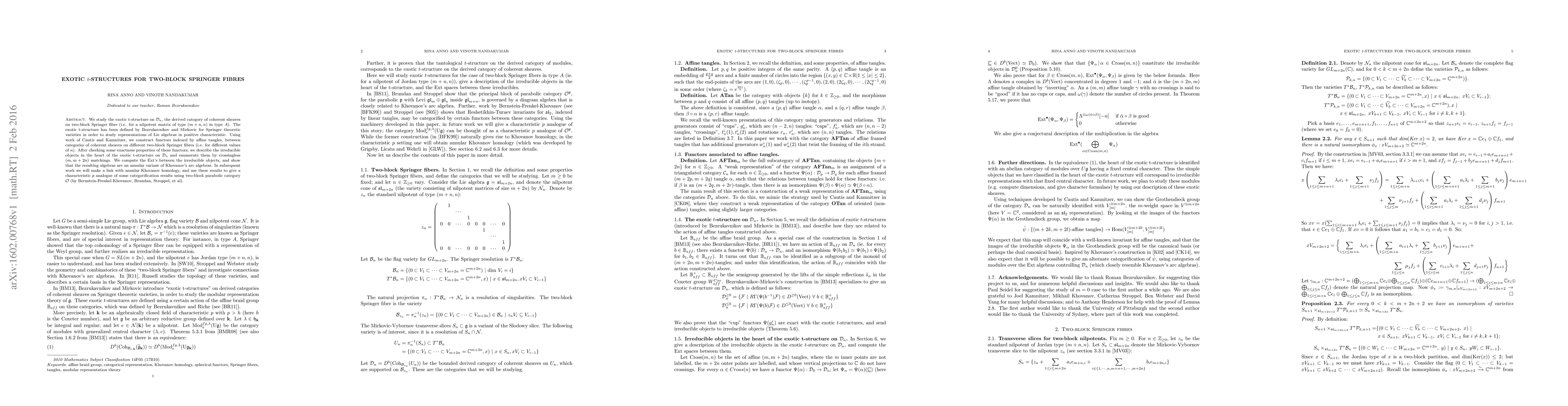 We study the exotic t-structure on the derived category of coherent sheaves on two-block Springer fibre (i.e. for a nilpotent matrix of type (m+n,n) in type A). The exotic t-structure has been defined by Bezrukavnikov and Mirkovic for Springer theoretic varieties in order to study representations of Lie algebras in positive characteristic. Using work of Cautis and Kamnitzer, we construct functors indexed by affine tangles, between categories of coherent sheaves on different two-block Springer fibres (i.e. for different values of n). After checking some exactness properties of these functors, we describe the irreducible objects in the heart of the exotic t-structure, and enumerate them by crossingless (m,m+2n) matchings. We compute the Ext's between the irreducible objects, and show that the resulting algebras are an annular variant of Khovanov's arc algebras. In subsequent work we will make a link with annular Khovanov homology, and use these results to give a positive characteristic analogue of some categorification results using two-block parabolic category O (by Bernstein-Frenkel-Khovanov, Brundan, Stroppel, et al).