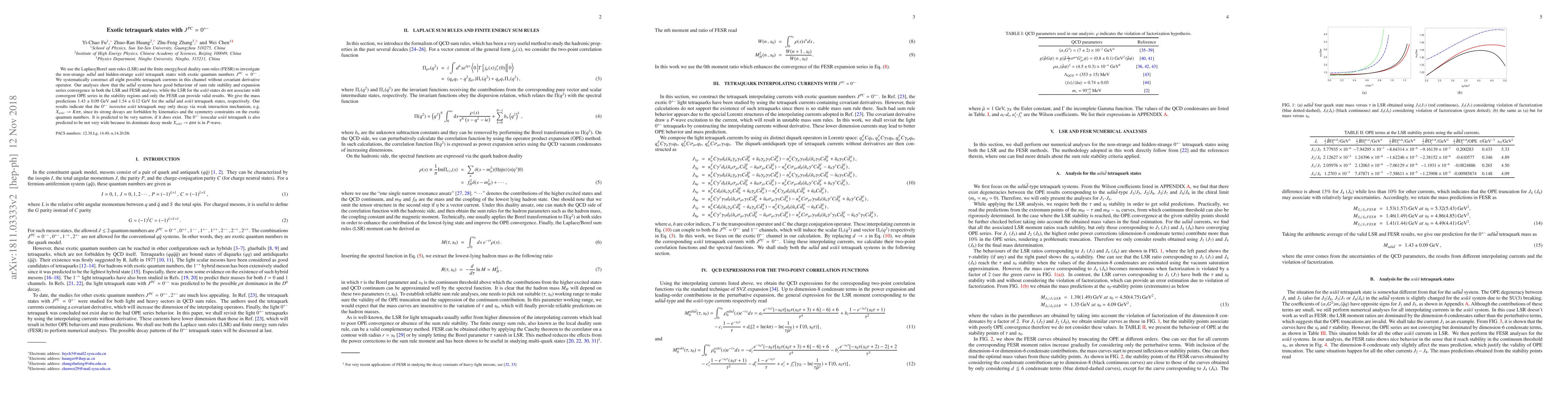 This paper investigates exotic tetraquark states with $J^{PC}=0^{+-}$ using sum rules, predicting masses for $ud\bar u\bar d$ and $us\bar u\bar s$ tetraquarks at $1.43\pm0.09$ GeV and $1.54\pm0.12$ GeV, respectively. The $us\bar u\bar s$ tetraquark is suggested to decay via weak interactions due to forbidden strong decays.