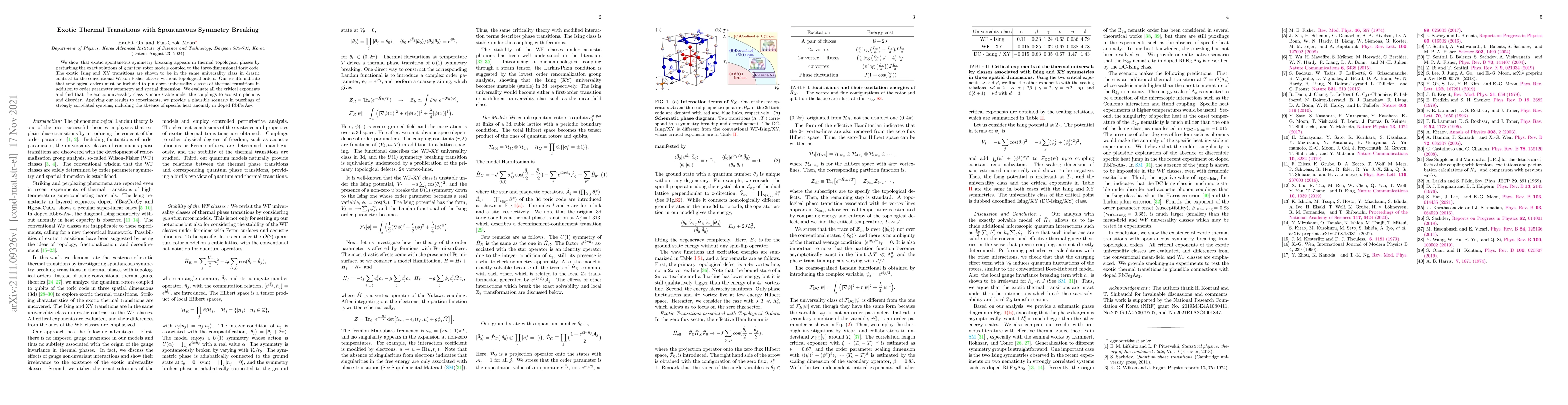 We show that exotic spontaneous symmetry breaking appears in thermal topological phases by perturbing the exact solutions of quantum rotor models coupled to the three-dimensional toric code. The exotic Ising and XY transitions are shown to be in the same universality class in drastic contrast to the conventional Wilson-Fisher classes without topological orders. Our results indicate that topological orders must be included to pin down universality classes of thermal transitions in addition to order parameter symmetry and spatial dimension. We evaluate all the critical exponents and find that the exotic universality class is more stable under the couplings to acoustic phonons and disorder. Applying our results to experiments, we provide a plausible scenario in puzzlings of strongly correlated systems, including the absence of specific heat anomaly in doped RbFe$_2$As$_2$.