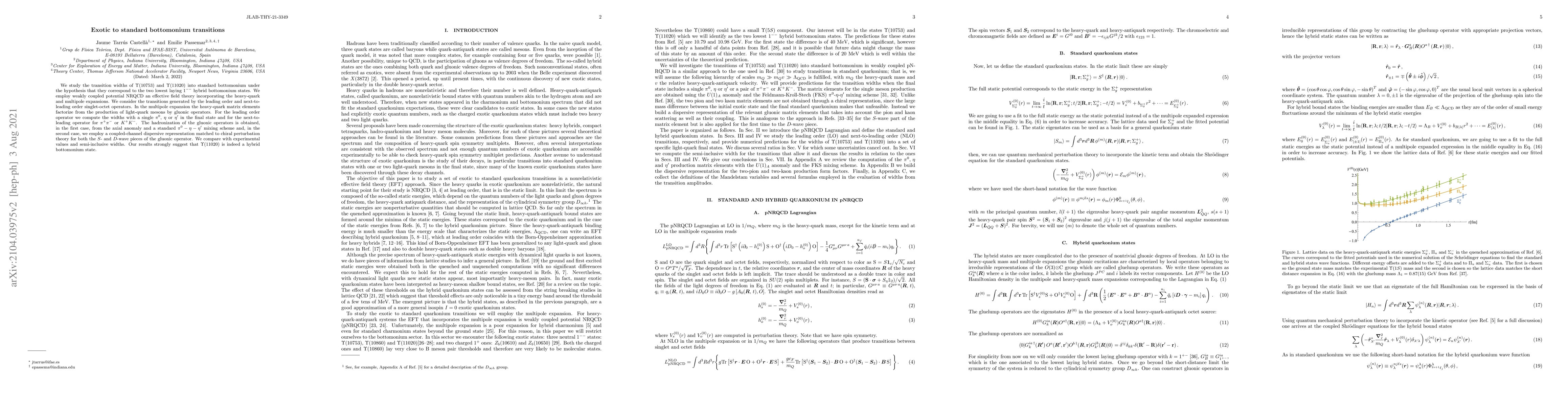 We study the transition widths of $\Upsilon(10753)$ and $\Upsilon(11020)$ into standard bottomonium under the hypothesis that they correspond to the two lowest laying $1^{--}$ hybrid bottomonium states. We employ weakly coupled potential NRQCD an effective filed theory incorporating the heavy quark and multipole expansions. We consider the transitions generated by the leading order and next-to-leading order singlet-octet operators. In the multipole expansion the heavy quark matrix elements factorize from the production of light-quark mesons by gluonic operators. For the leading order operator we compute the widths with a single $\pi^0$, $\eta$ or $\eta'$ in the final state and for the next-to-leading operator for $\pi^+\pi^-$ or $K^+K^-$. The hadronization of the gluonic operators is obtained, in the first case, from the axial anomaly and a standard $\pi^0-\eta-\eta'$ mixing scheme and, in the second case, we employ a coupled-channel dispersive representation matched to chiral perturbation theory for both the $S$ and $D$ wave pieces of the gluonic operator. We compare with experimental values and semi-inclusive widths. Our results strongly suggest that $\Upsilon(11020)$ is indeed a hybrid bottomonium state.