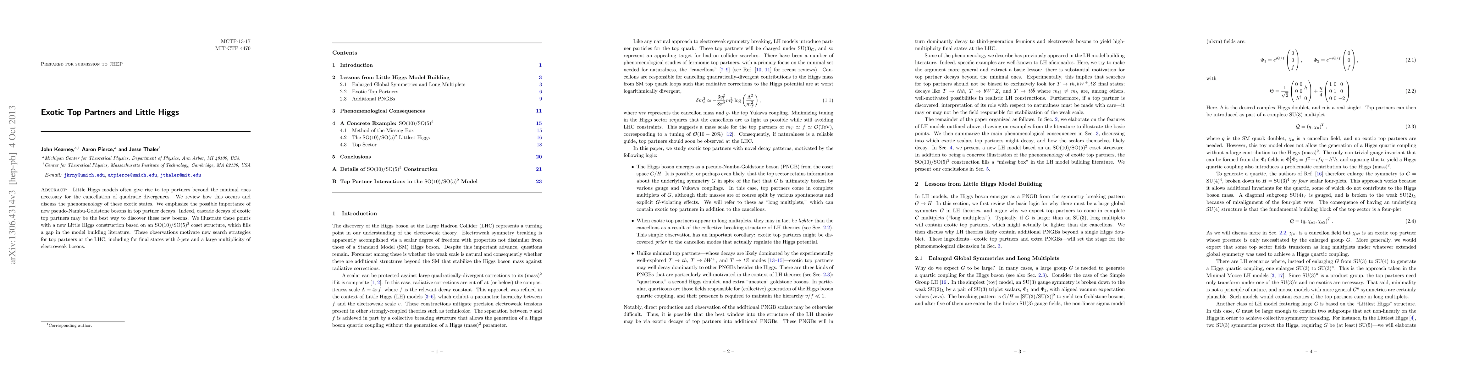 The paper reviews Little Higgs models, focusing on the occurrence of exotic top partners beyond minimal ones needed for quadratic divergence cancellation and the phenomenology of these states, particularly emphasizing the role of new pseudo-Nambu-Goldstone bosons in top partner decays.