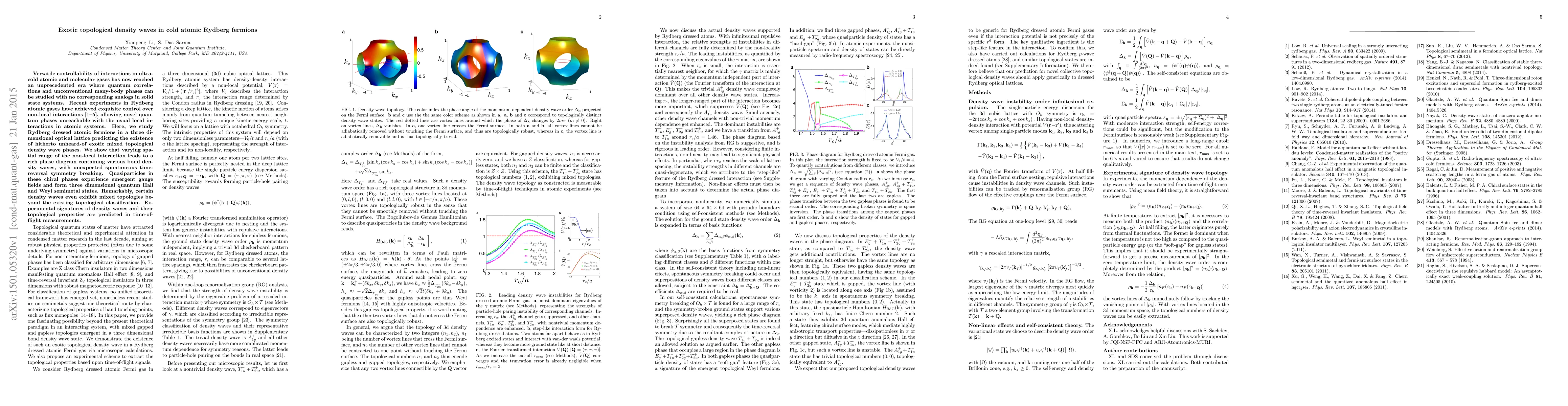 This paper explores novel quantum phases in Rydberg atomic fermions within a three-dimensional optical lattice, predicting the existence of exotic topological density waves with unexpected spontaneous time-reversal symmetry breaking and emergent gauge fields, leading to quantum Hall and Weyl semimetal states. Experimental signatures for these phases are proposed for detection via time-of-flight measurements.