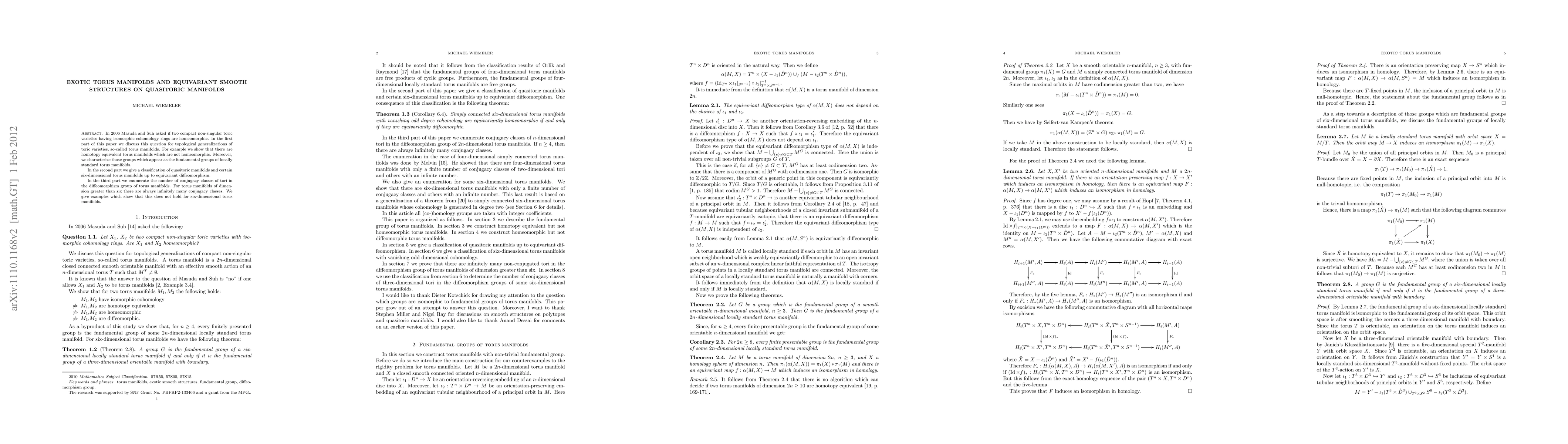 In 2006 Masuda and Suh asked if two compact non-singular toric varieties having isomorphic cohomology rings are homeomorphic. In the first part of this paper we discuss this question for topological generalizations of toric varieties, so-called torus manifolds. For example we show that there are homotopy equivalent torus manifolds which are not homeomorphic. Moreover, we characterize those groups which appear as the fundamental groups of locally standard torus manifolds. In the second part we give a classification of quasitoric manifolds and certain six-dimensional torus manifolds up to equivariant diffeomorphism. In the third part we enumerate the number of conjugacy classes of tori in the diffeomorphism group of torus manifolds. For torus manifolds of dimension greater than six there are always infinitely many conjugacy classes. We give examples which show that this does not hold for six-dimensional torus manifolds.