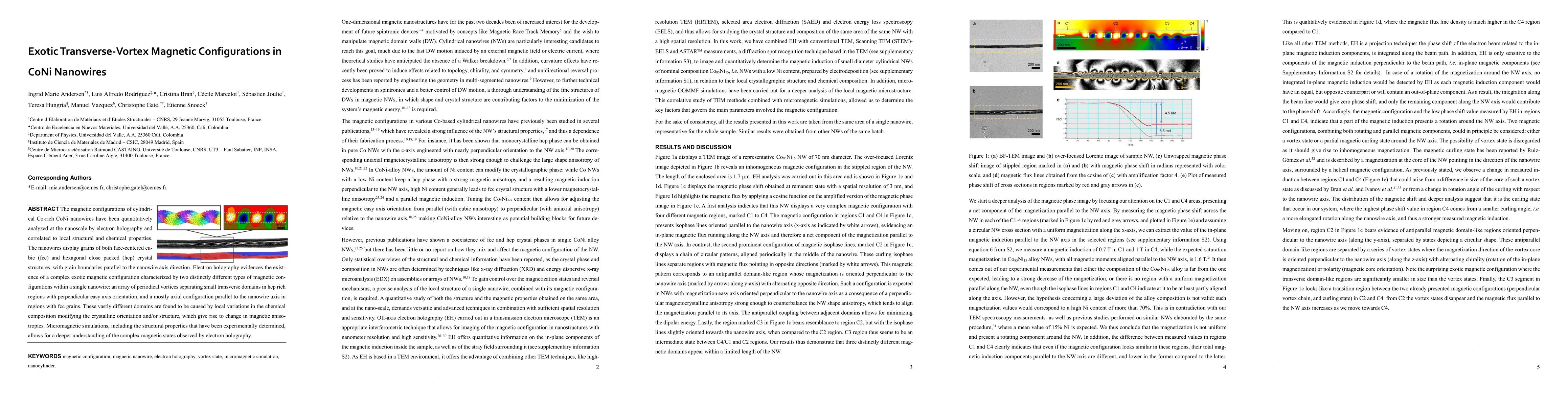 This study uses electron holography to analyze the magnetic configurations in CoNi nanowires, revealing exotic transverse-vortex structures in hcp regions and axial configurations in fcc regions, driven by local chemical composition variations. Micromagnetic simulations corroborate these findings, linking structural properties to the observed magnetic anisotropy changes.