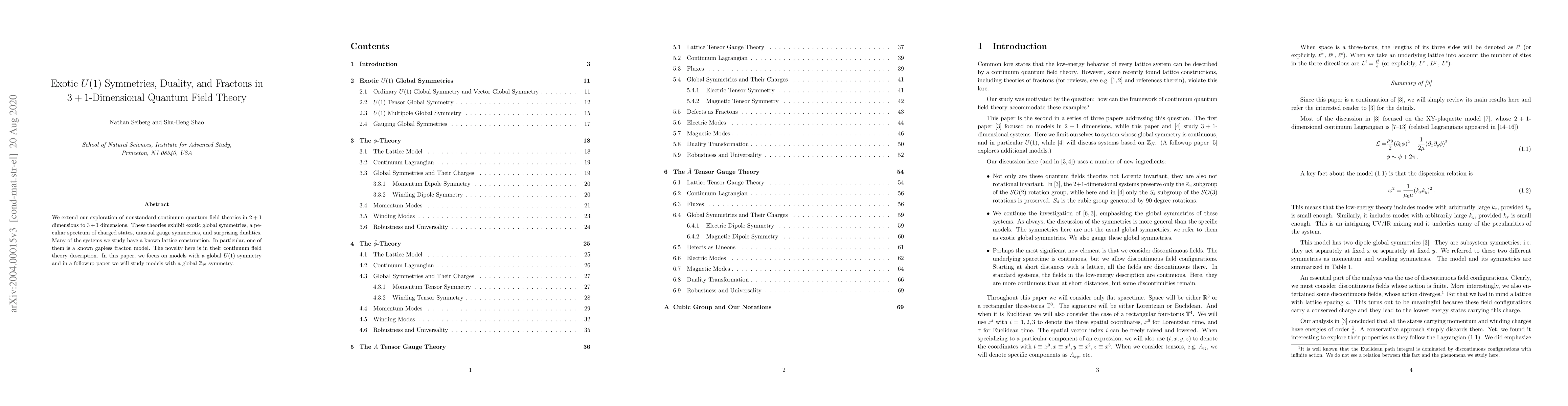 This paper investigates exotic continuum quantum field theories in 3+1 dimensions featuring unusual global $U(1)$ symmetries, fractons, and unexpected dualities. The study extends previous work in 2+1 dimensions and highlights novel continuum descriptions of known lattice fracton models.