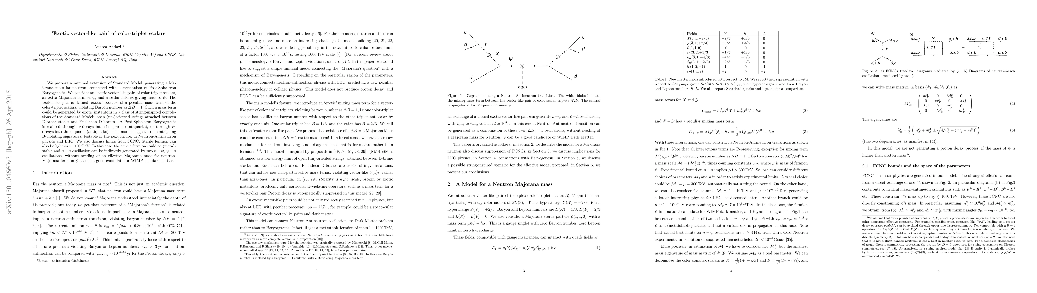 We propose a minimal extension of Standard Model, generating a Majorana mass for neutron, connected with a mechanism of Post-Sphaleron Baryogenesis. We consider an `exotic vector-like pair' of color-triplet scalars, an extra Majorana fermion $\psi$, and a scalar field $\phi$, giving mass to $\psi$. The vector-like pair is defined `exotic' because of a peculiar mass term of the color-triplet scalars, violating Baryon number as $\Delta B=1$. A Post-Sphaleron Baryogenesis is realized through $\phi$-decays into six quarks (antiquarks), or through $\psi$-decays into three quarks (antiquarks). This model suggests some intriguing B-violating signatures, testable in the next future, in Neutron-Antineutron physics and LHC. We also discuss limits from FCNC. Sterile fermion can also be light as $1-100\, \rm GeV$. In this case, the sterile fermion could be (meta)-stable and $n-\bar{n}$ oscillation can be indirectly generated by two $n-\psi$, $\psi-\bar{n}$ oscillations, without needing of an effective Majorana mass for neutron. Majorana fermion $\psi$ can be a good candidate for WIMP-like dark matter.