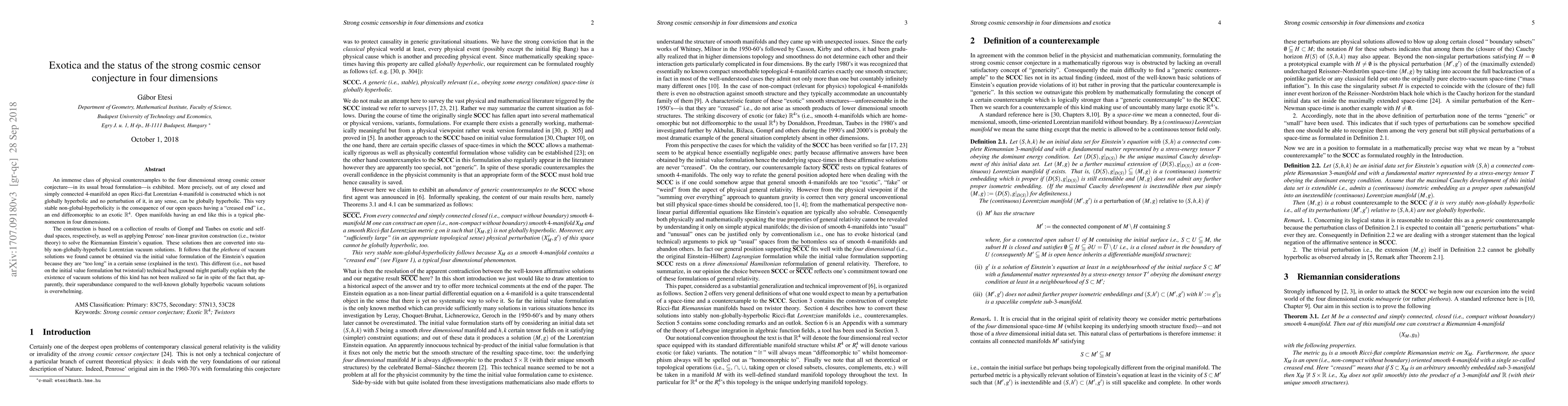 An immense class of physical counterexamples to the four dimensional strong cosmic censor conjecture---in its usual broad formulation---is exhibited. More precisely, out of any closed and simply connected 4-manifold an open Ricci-flat Lorentzian 4-manifold is constructed which is not globally hyperbolic and no perturbation of it, in any sense, can be globally hyperbolic. This very stable non-global-hyperbolicity is the consequence of our open spaces having a "creased end" i.e., an end diffeomorphic to an exotic ${\mathbb R}^4$. Open manifolds having an end like this is a typical phenomenon in four dimensions. The construction is based on a collection of results of Gompf and Taubes on exotic and self-dual spaces, respectively, as well as applying Penrose' non-linear graviton construction (i.e., twistor theory) to solve the Riemannian Einstein's equation. These solutions then are converted into stably non-globally-hyperbolic Lorentzian vacuum solutions. It follows that the plethora of vacuum solutions we found cannot be obtained via the initial value formulation of the Einstein's equation because they are "too long" in a certain sense (explained in the text). This different (i.e., not based on the initial value formulation but twistorial) technical background might partially explain why the existence of vacuum solutions of this kind have not been realized so far in spite of the fact that, apparently, their superabundance compared to the well-known globally hyperbolic vacuum solutions is overwhelming.
