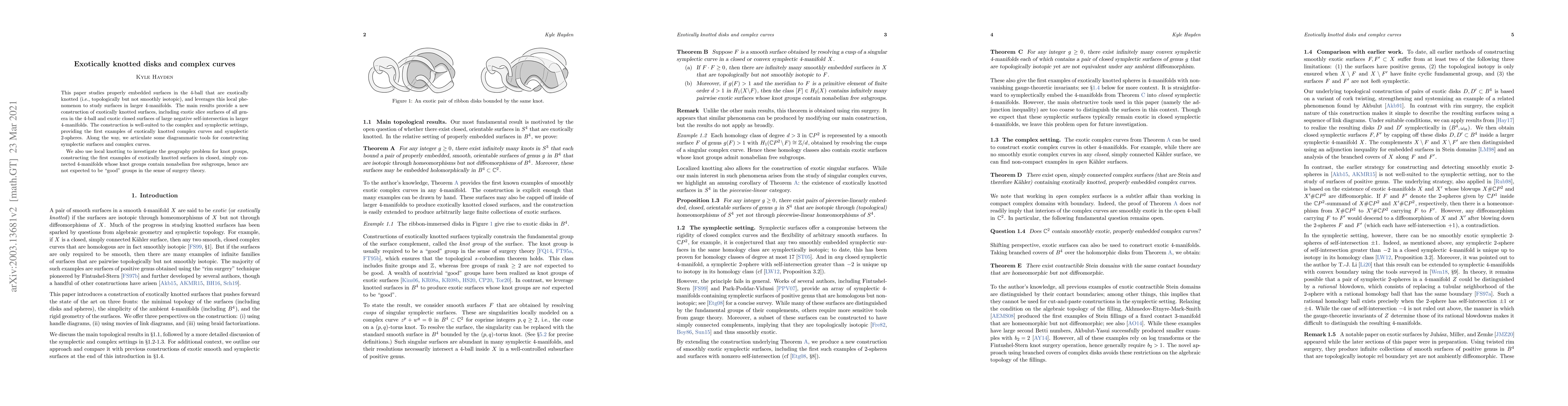 This paper studies properly embedded surfaces in the 4-ball that are exotically knotted (i.e., topologically but not smoothly isotopic), and leverages this local phenomenon to study surfaces in larger 4-manifolds. The main results provide a new construction of exotically knotted surfaces, including exotic slice surfaces of all genera in the 4-ball and exotic closed surfaces in larger 4-manifolds. The construction is well-suited to the complex and symplectic settings, providing the first examples of exotically knotted complex curves and symplectic 2-spheres. Along the way, we articulate some diagrammatic tools for constructing symplectic surfaces and complex curves. We also use local knotting to investigate the geography problem for knot groups, constructing the first examples of exotically knotted surfaces in closed, simply connected 4-manifolds whose knot groups contain nonabelian free subgroups, hence are not expected to be "good" groups in the sense of surgery theory.