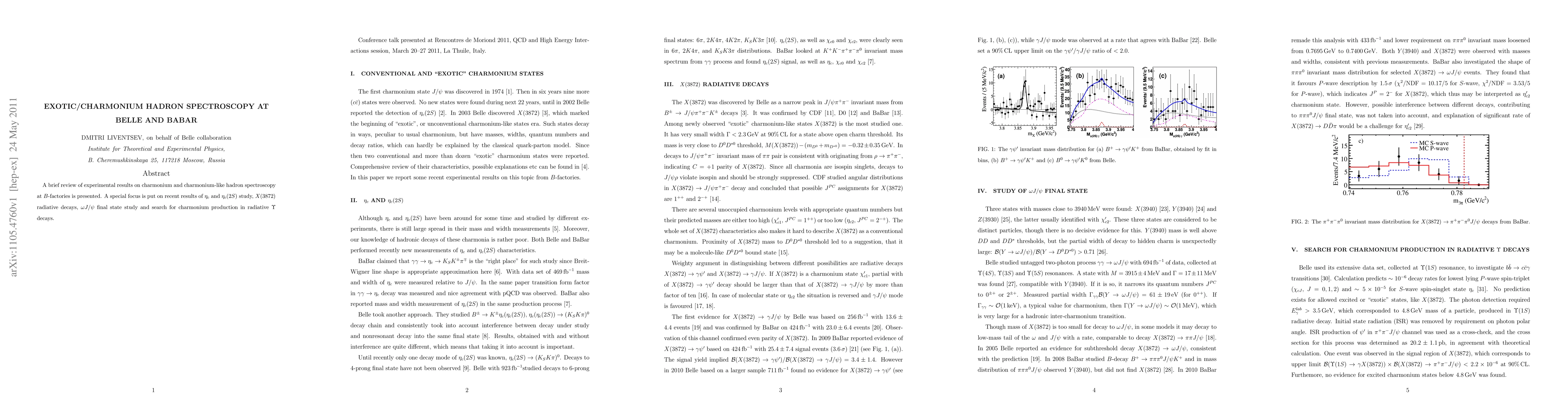 This paper reviews experimental findings on charmonium and related hadron spectroscopy from B-factories, emphasizing recent studies on eta_c, eta_c(2S), X(3872) decays, and omega J/psi final states, alongside searches for charmonium in radiative Upsilon decays.
