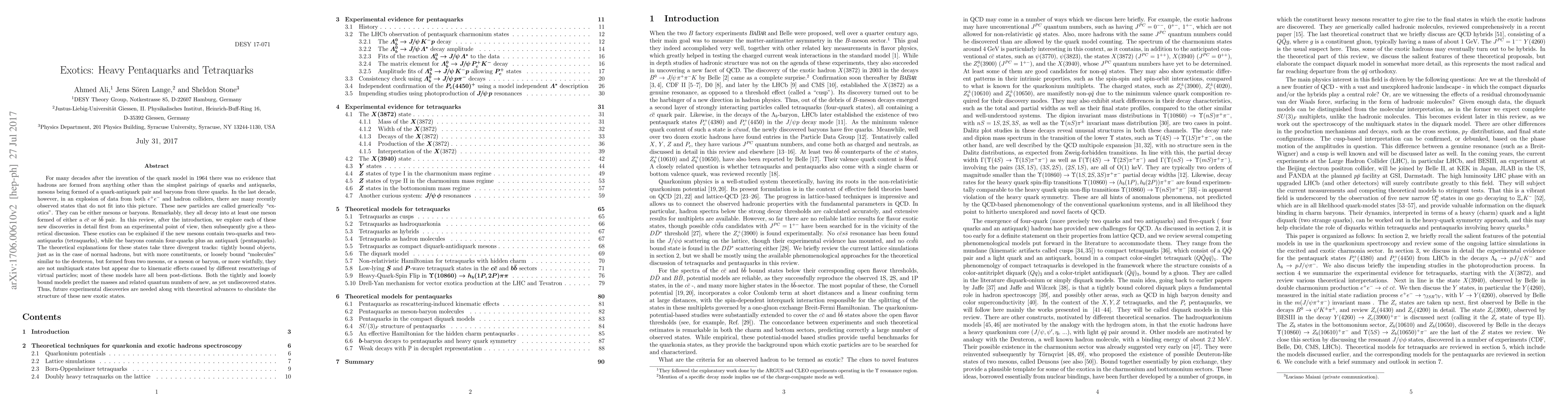 For many decades after the invention of the quark model in 1964 there was no evidence that hadrons are formed from anything other than the simplest pairings of quarks and antiquarks, mesons being formed of a quark-antiquark pair and baryons from three quarks. In the last decade, however, in an explosion of data from both $e^+e^-$ and hadron colliders, there are many recently observed states that do not fit into this picture. These new particles are called generically "exotics". They can be either mesons or baryons. Remarkably, they all decay into at least one meson formed of either a $c\overline{c}$ or $b\overline{b}$ pair. In this review, after the introduction, we explore each of these new discoveries in detail first from an experimental point of view, then subsequently give a theoretical discussion. These exotics can be explained if the new mesons contain two-quarks and two-antiquarks (tetraquarks), while the baryons contain four-quarks plus an antiquark (pentquarks). The theoretical explanations for these states take three divergent tracks: tightly bound objects, just as in the case of normal hadrons, but with more constituents, or loosely bound "molecules" similar to the deuteron, but formed from two mesons, or a meson or baryon, or more wistfully, they are not multiquark states but appear due to kinematic effects caused by different rescatterings of virtual particles; most of these models have all been post-dictions. Both the tightly and loosely bound models predict the masses and related quantum numbers of new, as yet undiscovered states. Thus, future experimental discoveries are needed along with theoretical advances to elucidate the structure of these new exotic states.