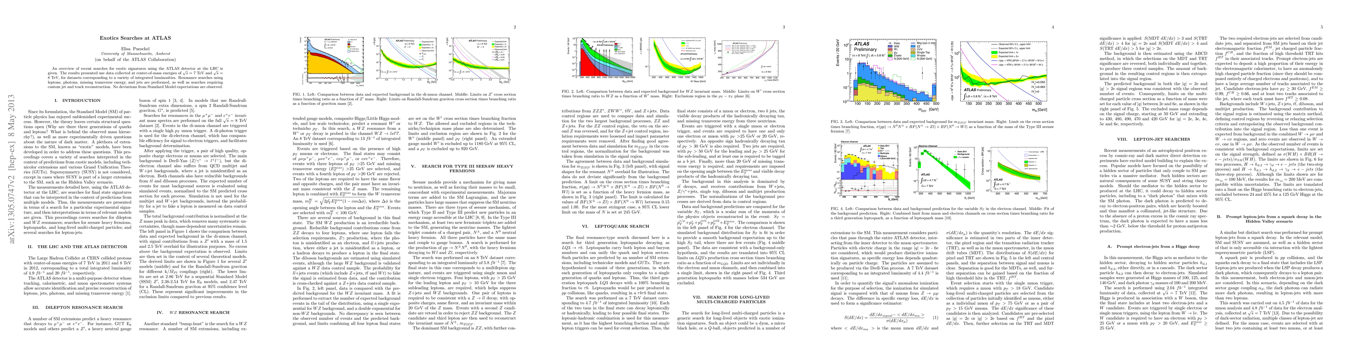 This paper reviews recent ATLAS searches for exotic particles at the LHC using data from 7 TeV and 8 TeV collisions, focusing on various signatures including resonances with leptons, photons, and jets. No evidence of new physics beyond the Standard Model was found.