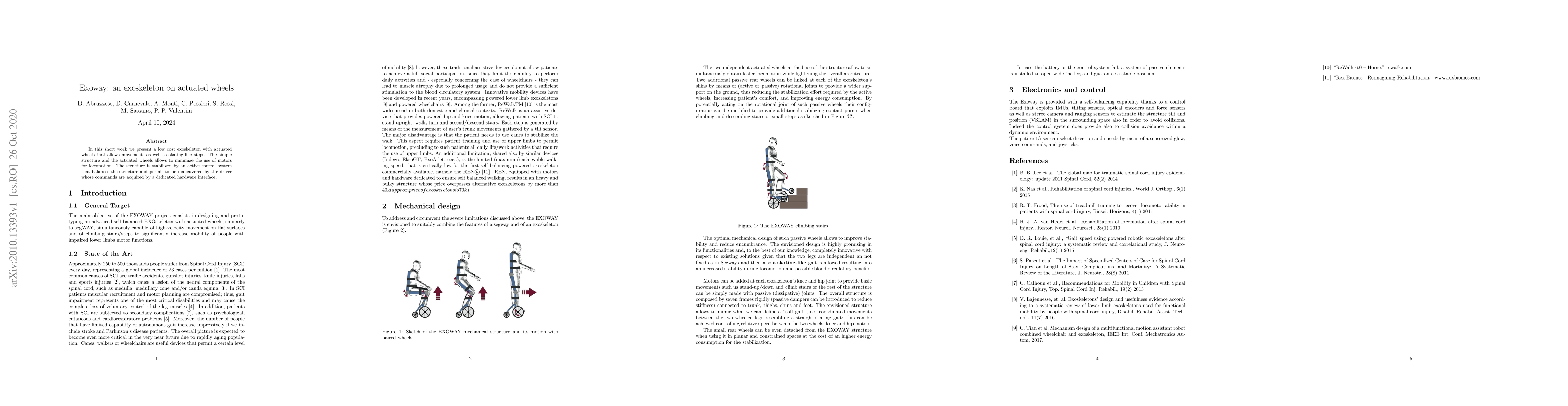 A low-cost exoskeleton with actuated wheels was developed to enable movement and skating-like steps, minimizing the use of motors for locomotion and utilizing an active control system for stabilization.