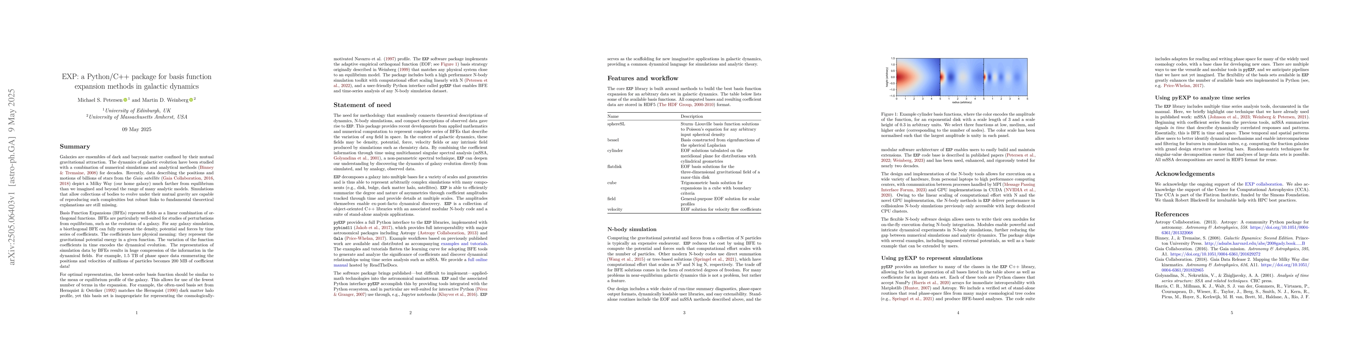 The EXP package provides a Python/C++ library for basis function expansion in galactic dynamics, enabling complex simulations and dynamical discovery, with a focus on time series analysis and automated signal detection.