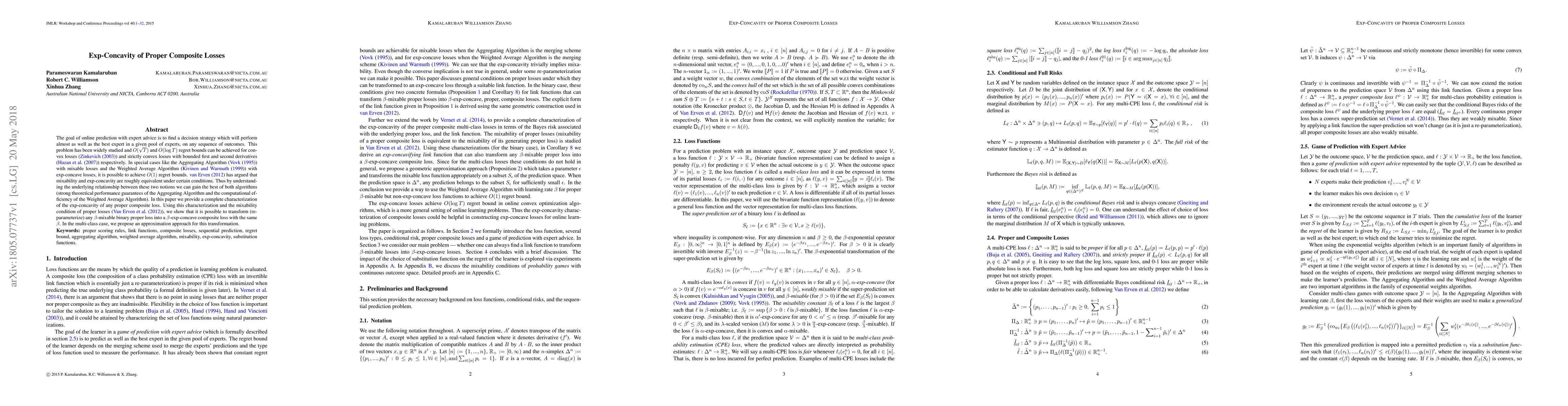 The goal of online prediction with expert advice is to find a decision strategy which will perform almost as well as the best expert in a given pool of experts, on any sequence of outcomes. This problem has been widely studied and $O(\sqrt{T})$ and $O(\log{T})$ regret bounds can be achieved for convex losses (\cite{zinkevich2003online}) and strictly convex losses with bounded first and second derivatives (\cite{hazan2007logarithmic}) respectively. In special cases like the Aggregating Algorithm (\cite{vovk1995game}) with mixable losses and the Weighted Average Algorithm (\cite{kivinen1999averaging}) with exp-concave losses, it is possible to achieve $O(1)$ regret bounds. \cite{van2012exp} has argued that mixability and exp-concavity are roughly equivalent under certain conditions. Thus by understanding the underlying relationship between these two notions we can gain the best of both algorithms (strong theoretical performance guarantees of the Aggregating Algorithm and the computational efficiency of the Weighted Average Algorithm). In this paper we provide a complete characterization of the exp-concavity of any proper composite loss. Using this characterization and the mixability condition of proper losses (\cite{van2012mixability}), we show that it is possible to transform (re-parameterize) any $\beta$-mixable binary proper loss into a $\beta$-exp-concave composite loss with the same $\beta$. In the multi-class case, we propose an approximation approach for this transformation.