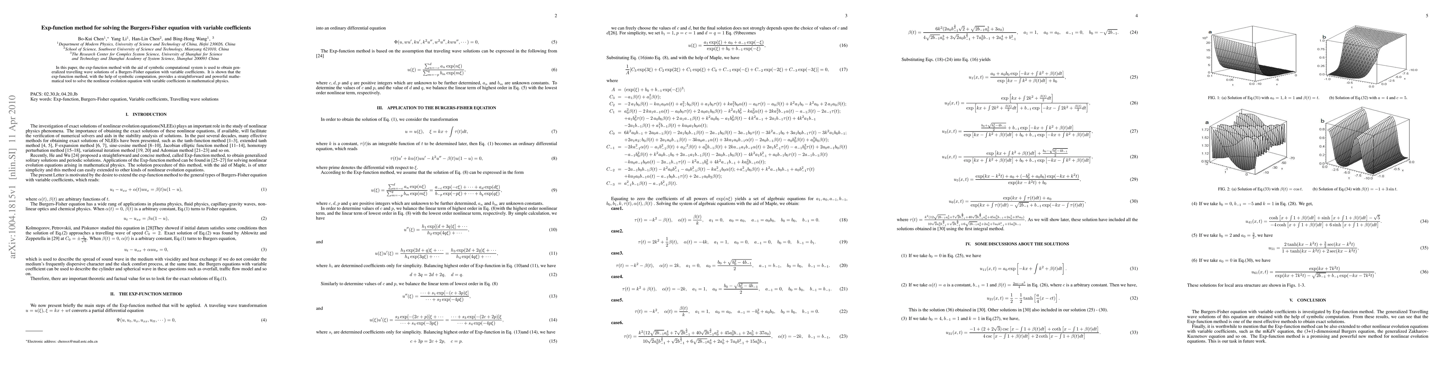 Summary: The paper employs the exp-function method, assisted by symbolic computation, to derive generalized travelling wave solutions for the Burgers-Fisher equation with variable coefficients, demonstrating its effectiveness as a powerful tool for solving nonlinear evolution equations in mathematical physics.
