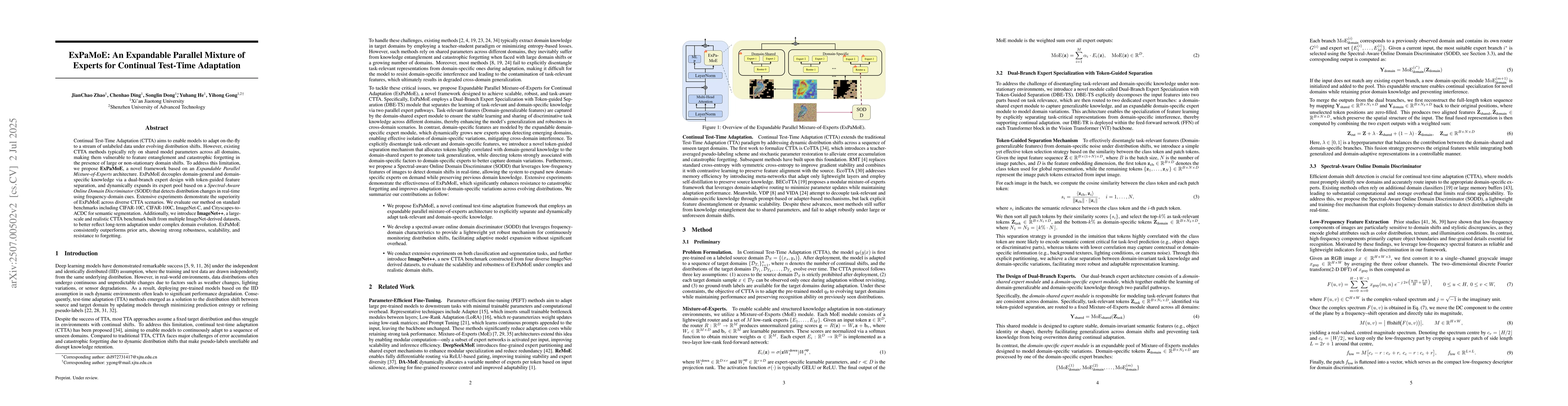 Continual Test-Time Adaptation (CTTA) aims to enable models to adapt on-the-fly to a stream of unlabeled data under evolving distribution shifts. However, existing CTTA methods typically rely on shared model parameters across all domains, making them vulnerable to feature entanglement and catastrophic forgetting in the presence of large or non-stationary domain shifts. To address this limitation, we propose ExPaMoE, a novel framework based on an Expandable Parallel Mixture-of-Experts architecture. ExPaMoE decouples domain-general and domain-specific knowledge via a dual-branch expert design with token-guided feature separation, and dynamically expands its expert pool based on a Spectral-Aware Online Domain Discriminator (SODD) that detects distribution changes in real-time using frequency-domain cues. Extensive experiments demonstrate the superiority of ExPaMoE across diverse CTTA scenarios. We evaluate our method on standard benchmarks including CIFAR-10C, CIFAR-100C, ImageNet-C, and Cityscapes-to-ACDC for semantic segmentation. Additionally, we introduce ImageNet++, a large-scale and realistic CTTA benchmark built from multiple ImageNet-derived datasets, to better reflect long-term adaptation under complex domain evolution. ExPaMoE consistently outperforms prior arts, showing strong robustness, scalability, and resistance to forgetting.