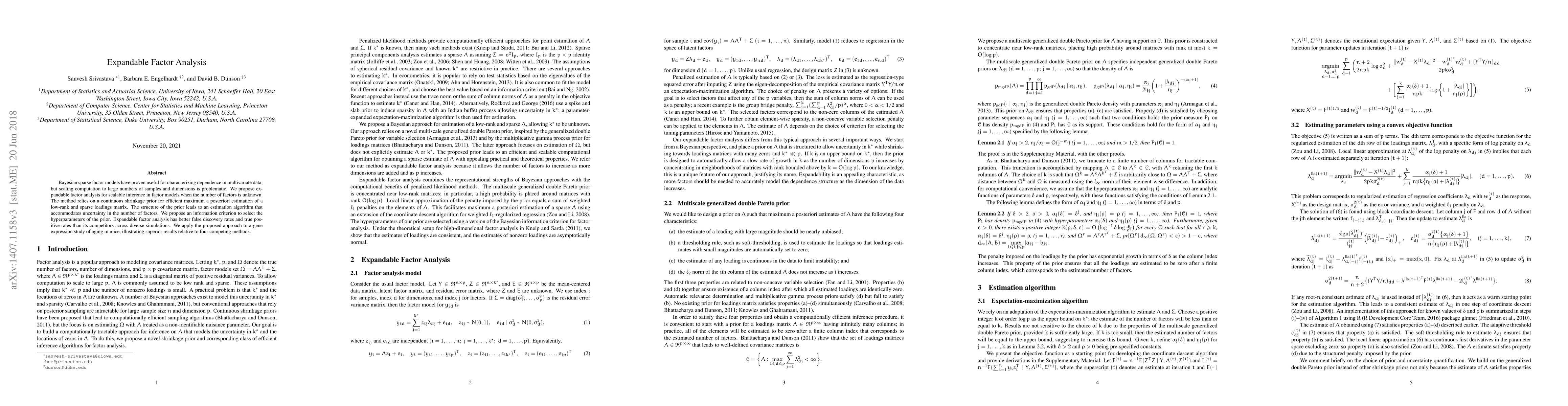 Expandable factor analysis introduces a scalable Bayesian sparse factor model for large datasets, employing a continuous shrinkage prior for efficient inference. The method effectively handles unknown factor numbers and outperforms competitors in simulations and a real-world gene expression study on aging in mice.