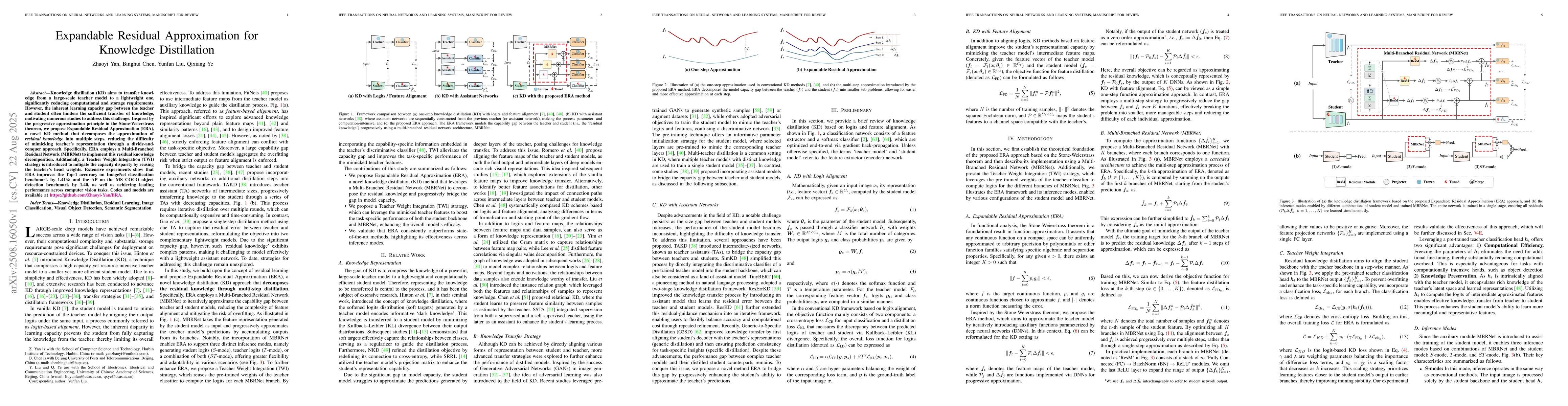 Knowledge distillation (KD) aims to transfer knowledge from a large-scale teacher model to a lightweight one, significantly reducing computational and storage requirements. However, the inherent learning capacity gap between the teacher and student often hinders the sufficient transfer of knowledge, motivating numerous studies to address this challenge. Inspired by the progressive approximation principle in the Stone-Weierstrass theorem, we propose Expandable Residual Approximation (ERA), a novel KD method that decomposes the approximation of residual knowledge into multiple steps, reducing the difficulty of mimicking the teacher's representation through a divide-and-conquer approach. Specifically, ERA employs a Multi-Branched Residual Network (MBRNet) to implement this residual knowledge decomposition. Additionally, a Teacher Weight Integration (TWI) strategy is introduced to mitigate the capacity disparity by reusing the teacher's head weights. Extensive experiments show that ERA improves the Top-1 accuracy on the ImageNet classification benchmark by 1.41% and the AP on the MS COCO object detection benchmark by 1.40, as well as achieving leading performance across computer vision tasks. Codes and models are available at https://github.com/Zhaoyi-Yan/ERA.