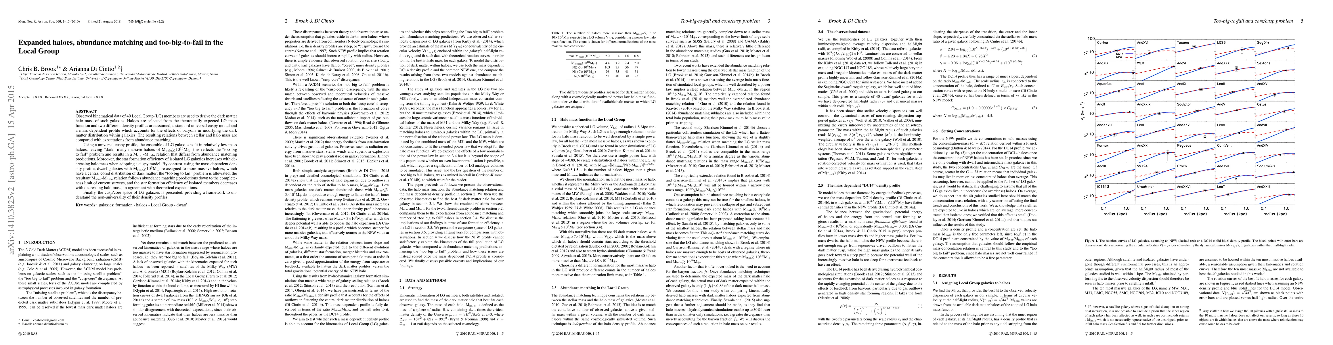 This paper investigates the dark matter halo masses of 40 Local Group galaxies using kinematical data and compares these with theoretical predictions from abundance matching. It finds that a mass-dependent density profile alleviates the "too big to fail" problem, aligning the stellar-halo mass relation with abundance matching predictions, while a universal cuspy model does not.